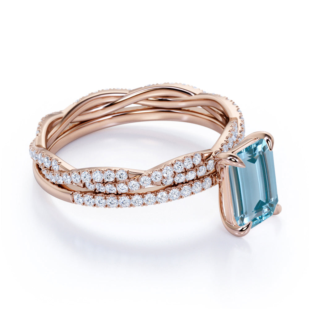 Pave 1.25 ct Emerald Cut Aquamarine Infinity Bridal Ring Set