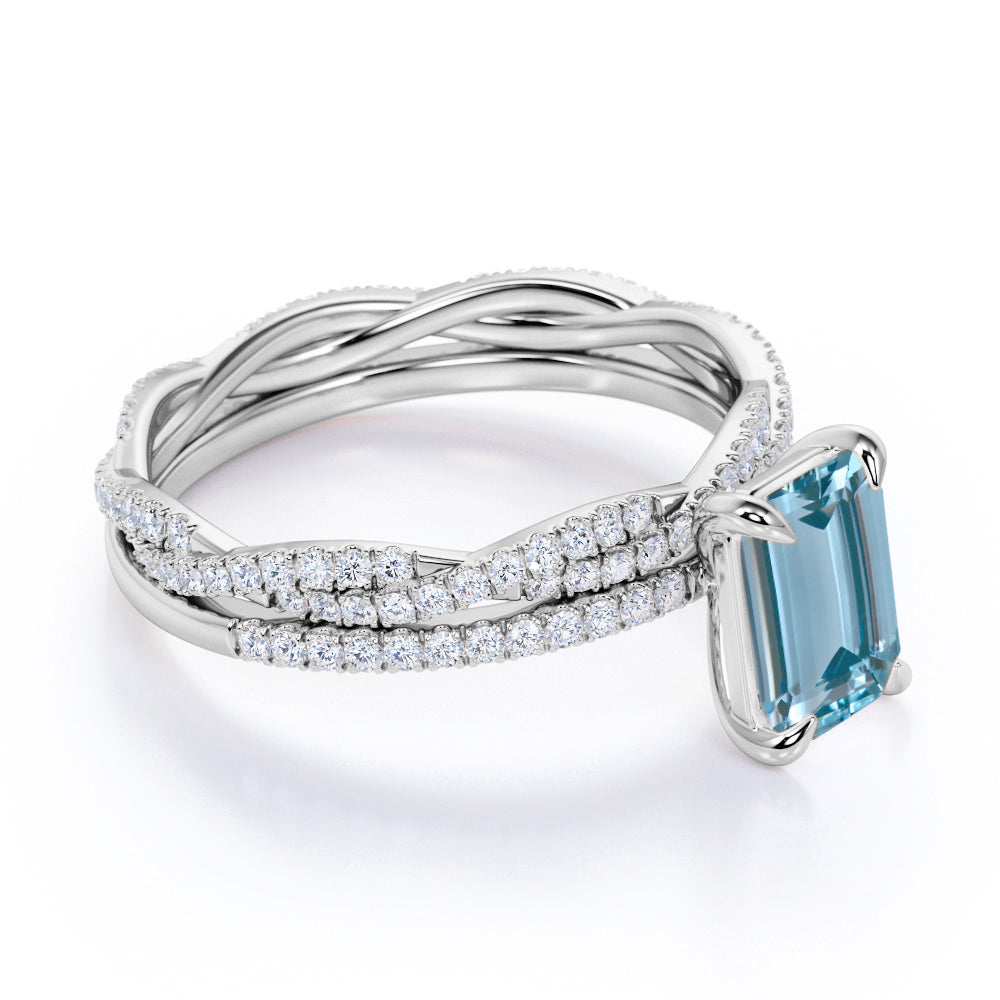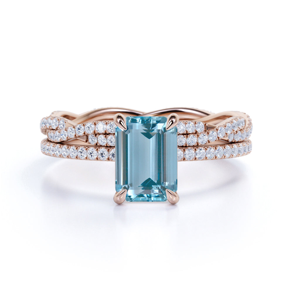 Pave 1.25 ct Emerald Cut Aquamarine Infinity Bridal Ring Set