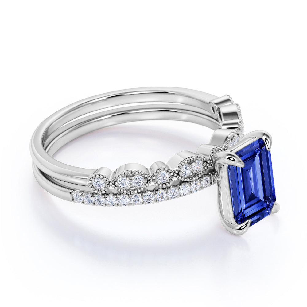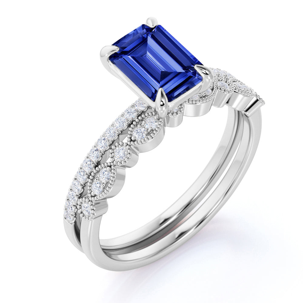 Art deco 1.25 Carat emerald cut Sapphire and Diamond Wedding Bridal Ring Set in White Gold