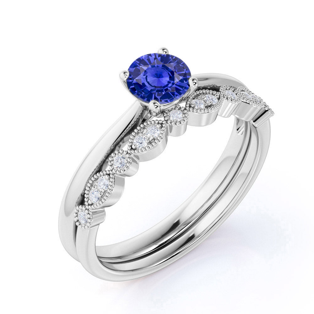 Art-deco 1.15 Carat Round cut Lab-Created Sapphire and Diamond Wedding Bridal Ring Set in White Gold. Handmade antique blue Sapphire wedding ring set with engagement ring and wedding bands showcases total 1.15 carats perfect Lab-Created blue Sapphire and glittering diamonds and is made in White Gold. Break away from the generic look of mass-produced jewelry with this intricate handmade piece. And as always, the order comes with our 30 DAYS FULL REFUND policy, GUARANTEED DELIVERY within 2 weeks, and in a BEAUTIFUL Jewelry Ring Box.
