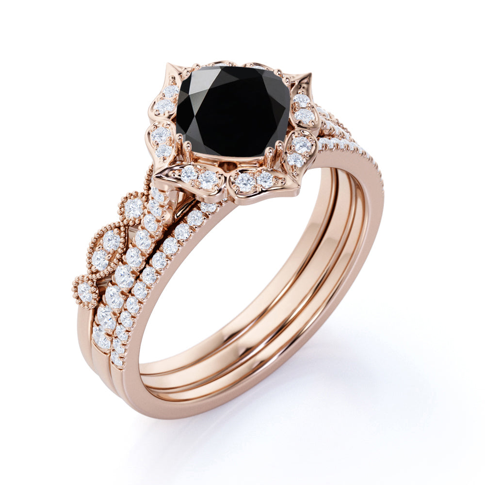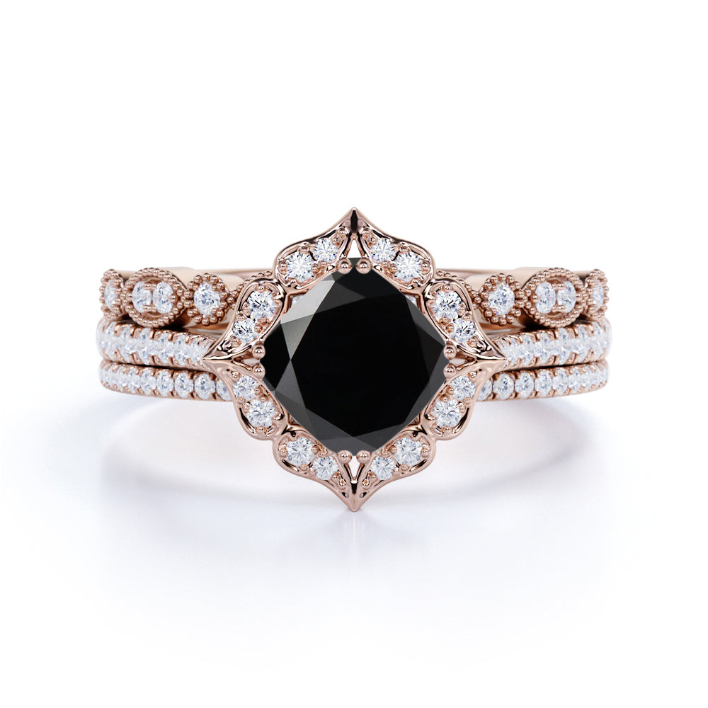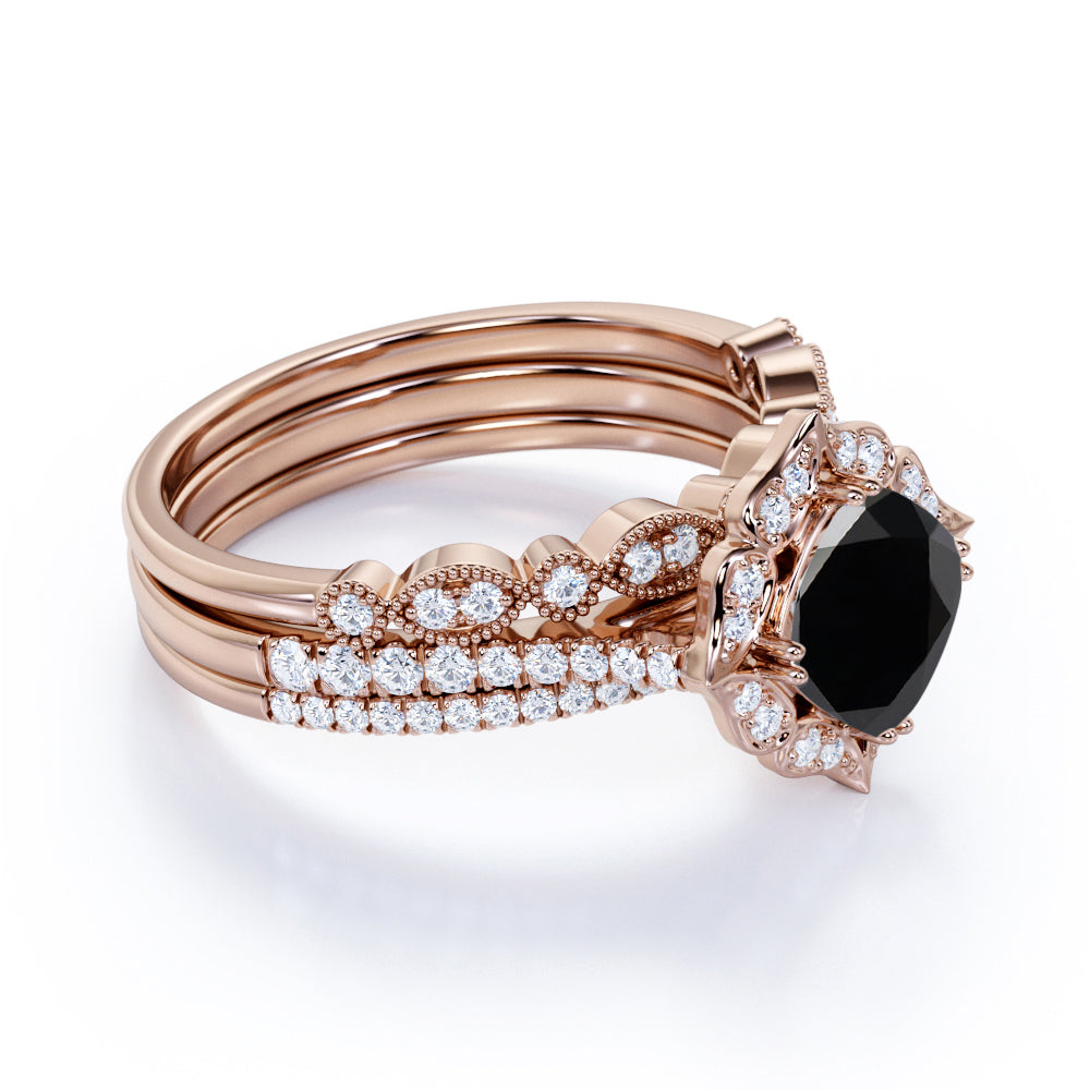 Artdeco 2 Carat Cushion cut Black Diamond Trio Wedding Bridal Ring Set Rose Gold. Fascinating black Diamond wedding set with engagement ring and wedding bands showcases 1 carat perfect lab created black diamond and 1 carat glittering diamonds and is made in solid 10k Rose Gold. Handmade ring for that unique and perfect look that is beautiful and extraordinary. And as always, the order comes with our 30 DAYS FULL REFUND policy, GUARANTEED DELIVERY within 5 Days, and in a BEAUTIFUL Jewelry Ring Box.