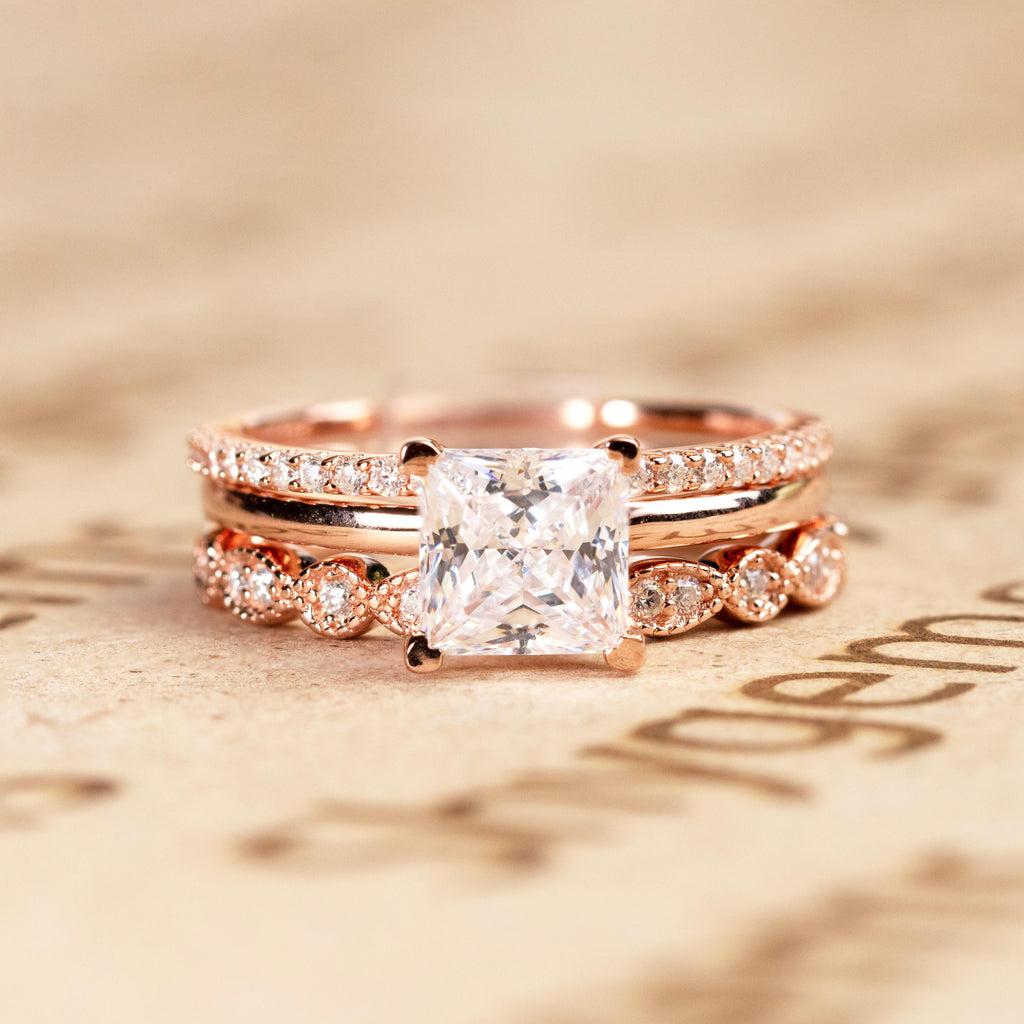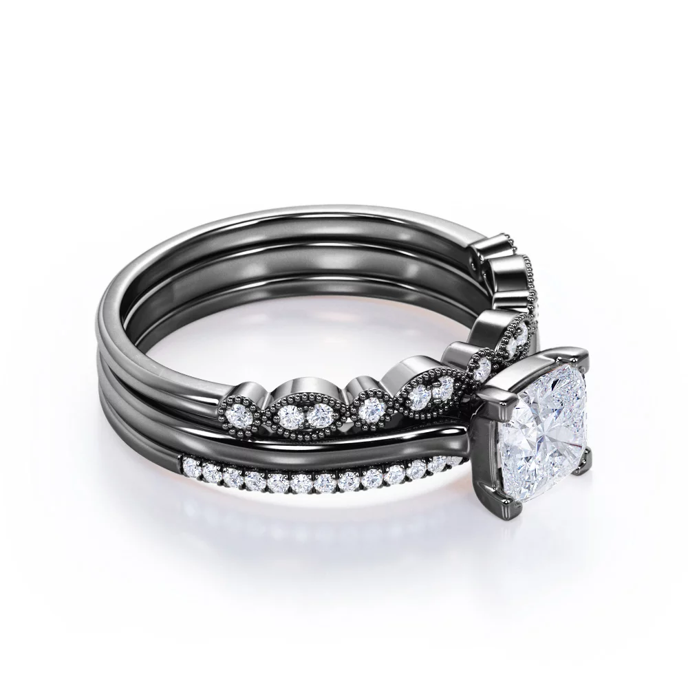 Artdeco 2 Carat Princess cut Moissanite Trio Wedding Bridal Ring Set in 18k White Gold over Silver. Fascinating white Moissanite wedding set with engagement ring and wedding bands showcases total 2 carats perfect real white Moissanites that can be a perfect alternative to diamond rings as moissanites have almost the same durability and quality as with diamonds that will last for a lifetime. Handmade ring for that unique and perfect look that is beautiful and extraordinary. The moissanite trio bridal set is perfect gift for anniversary, birthday, mothers day, or any other special occasion to celebrate.