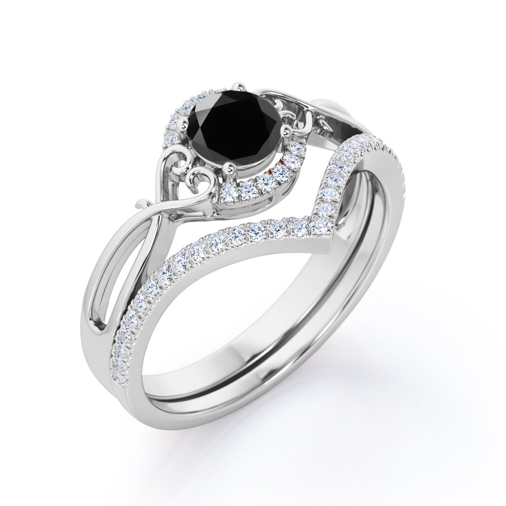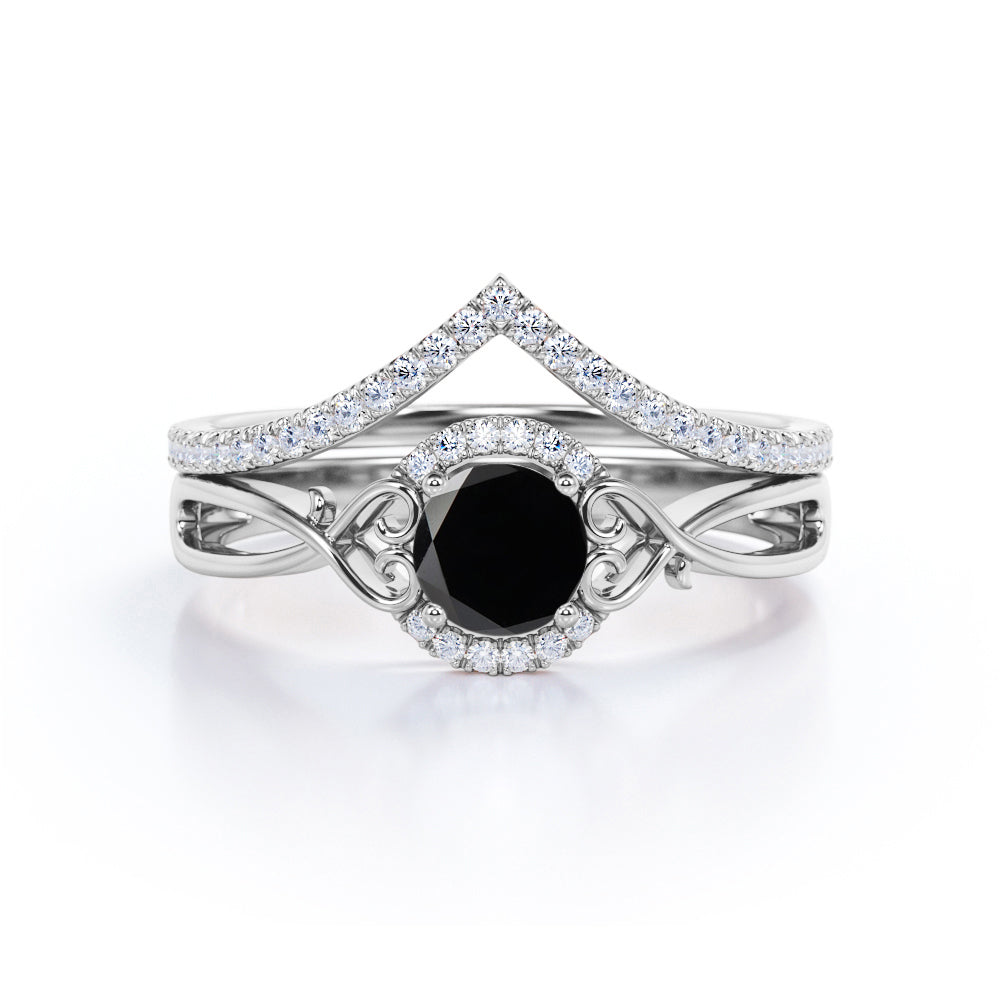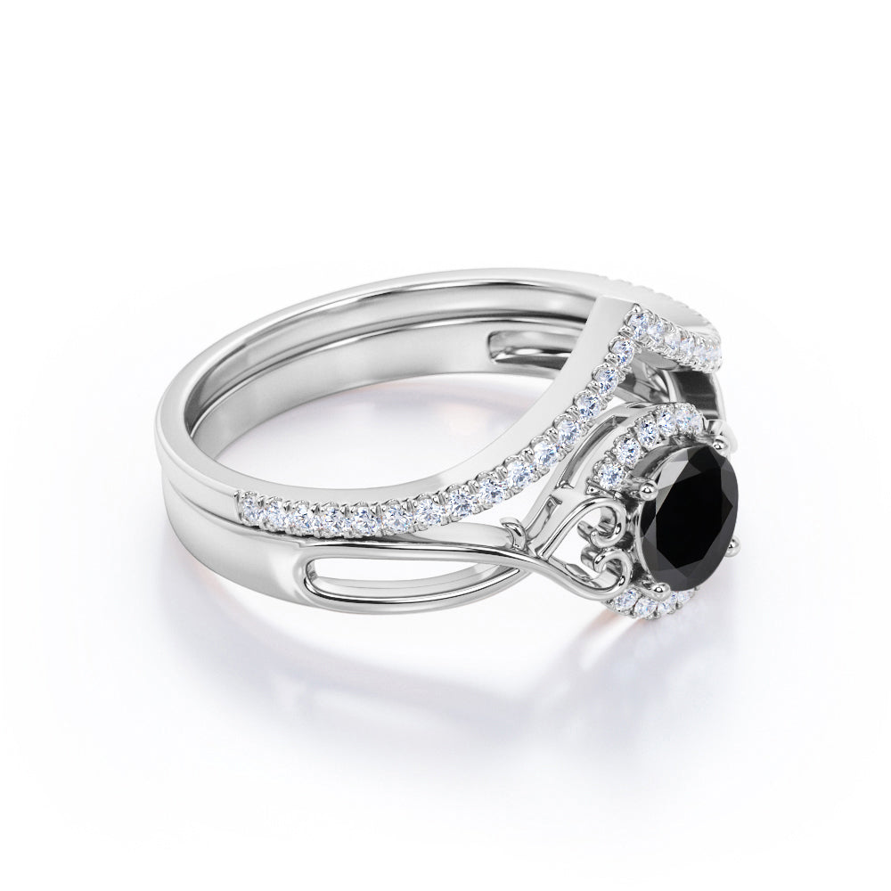Artdeco 1.50 Carat Round cut Black Diamond Trio Wedding Bridal Ring Set White Gold. Fascinating antique black Diamond wedding ring set with engagement ring and wedding bands highlights total 1.5 carats perfect lab created black diamond and glittering diamonds and is made in solid 10k White Gold. This piece of jewelry is handmade, sporting quality craftsmanship that will last for years to come. And as always, the order comes with our 30 DAYS FULL REFUND policy, GUARANTEED DELIVERY within 5 Days, and in a BEAUTIFUL Jewelry Ring Box.