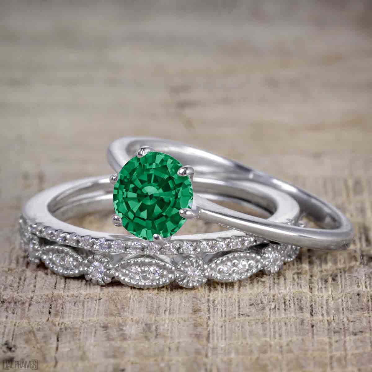 Artdeco 1.50 Carat Round cut Emerald and Moissanite Trio Wedding Ring Set 18k White Gold over Silver