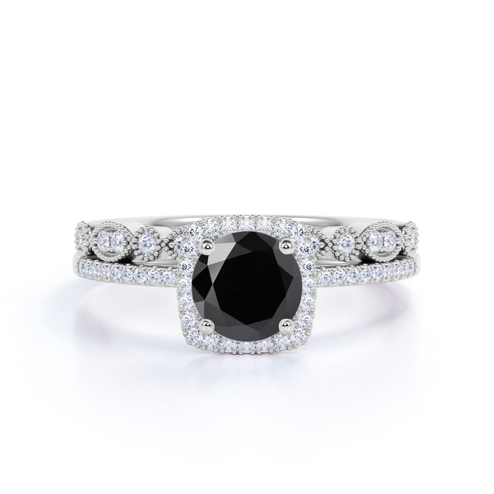 Artdeco scalloped 1.75 Carat Black Diamond Wedding Ring Set for Women in White Gold. Fascinating black Diamond affordable wedding ring set with engagement ring and wedding bands features 1 carat perfect lab created black diamond and 0.75 carat glittering diamonds and is made in solid 10k White Gold. This piece of jewelry is handmade, sporting quality craftsmanship that will last for years to come. And as always, the order comes with our 30 DAYS FULL REFUND policy, GUARANTEED DELIVERY within 5 Days, and in a BEAUTIFUL Jewelry Ring Box.