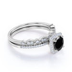 Artdeco scalloped 1.75 Carat Lab Black Diamond Wedding Ring Set for Women in White Gold