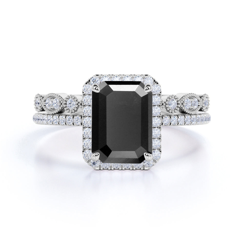 Artdeco scalloped 1.75 Carat Emerald cut Black Diamond Wedding Ring Set for Women in White Gold. Fascinating black Diamond affordable wedding ring set with engagement ring and wedding bands showcases 1 carat perfect lab created black diamond and 0.75 carat glittering diamonds and is made in solid 10k White Gold. This piece of jewelry is handmade, sporting quality craftsmanship that will last for years to come. And as always, the order comes with our 30 DAYS FULL REFUND policy and in a BEAUTIFUL Jewelry Ring Box.