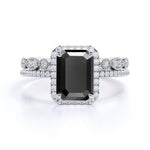 Artdeco scalloped 1.75 Carat Emerald cut Lab Black Diamond Wedding Ring Set for Women in White Gold