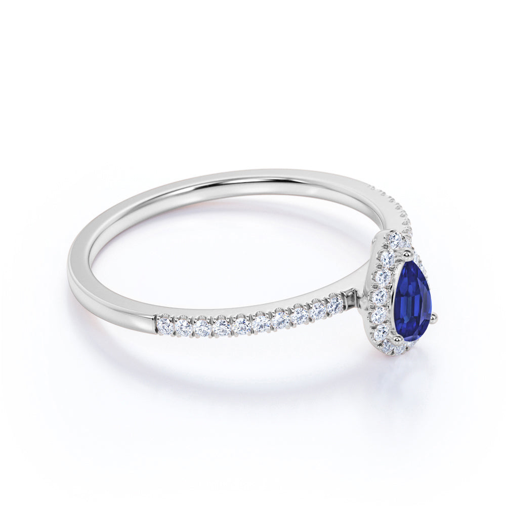 This affordable blue Lab-Created sapphire ring can also be made in rose, white or yellow gold and in 10k, 14k solid gold or 18k gold plating over silver. This blue Lab-Created sapphire engagement ring band is so durable and therefore, you can use it everyday and rely with this amazing blue sapphire daily wear engagement ring band. This blue sapphire ring features an approximately 0.5 carat teardrop shape Lab-Created blue sapphire, surrounded by 0.5 carat authentic diamond accent, for a total weight of 1 carats.