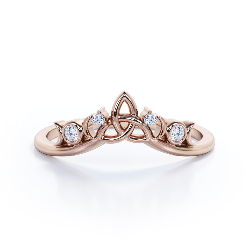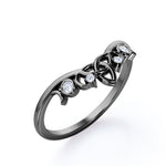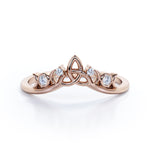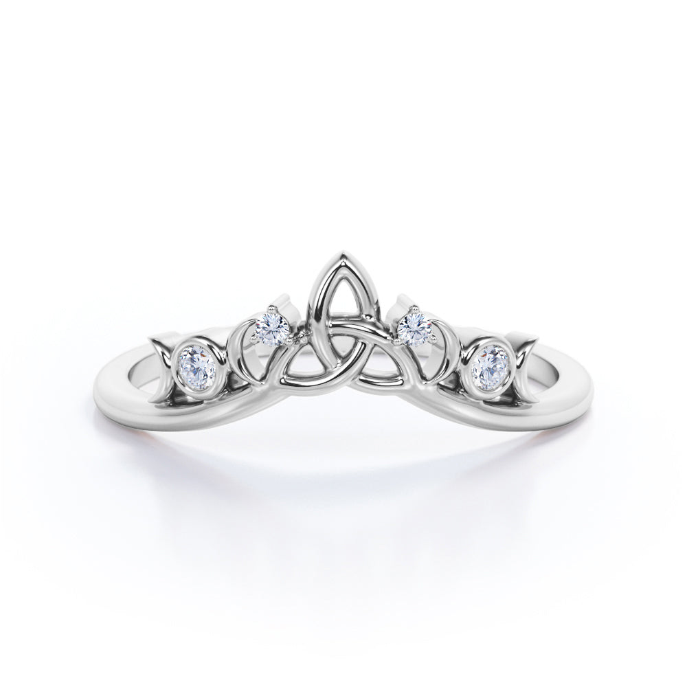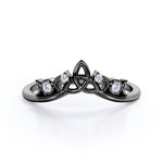 Be fashionable on your special event with the Artistic 0.1 carat Kite Moss Agate and Moissanite Wedding Band in White Gold. The chevron band features a Celtic knot at the center while dainty round Moissanite is scattered around the open work band. The band is intricately crafted in Gaelic pattern with crescent symbol at both sides. This stylish jewelry could be a lovely gift for your girlfriend, mom, sister or even yourself. It is suitable for all ages and come at a very affordable price. Choose the color that will suit their personalities best and give them on their special days like graduation, wedding, birthday. White gold, rose gold, yellow gold and black girl are up for you to choose and the band can be customized into 18k gold over silver, 10k gold and 14k gold.