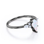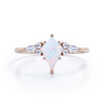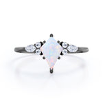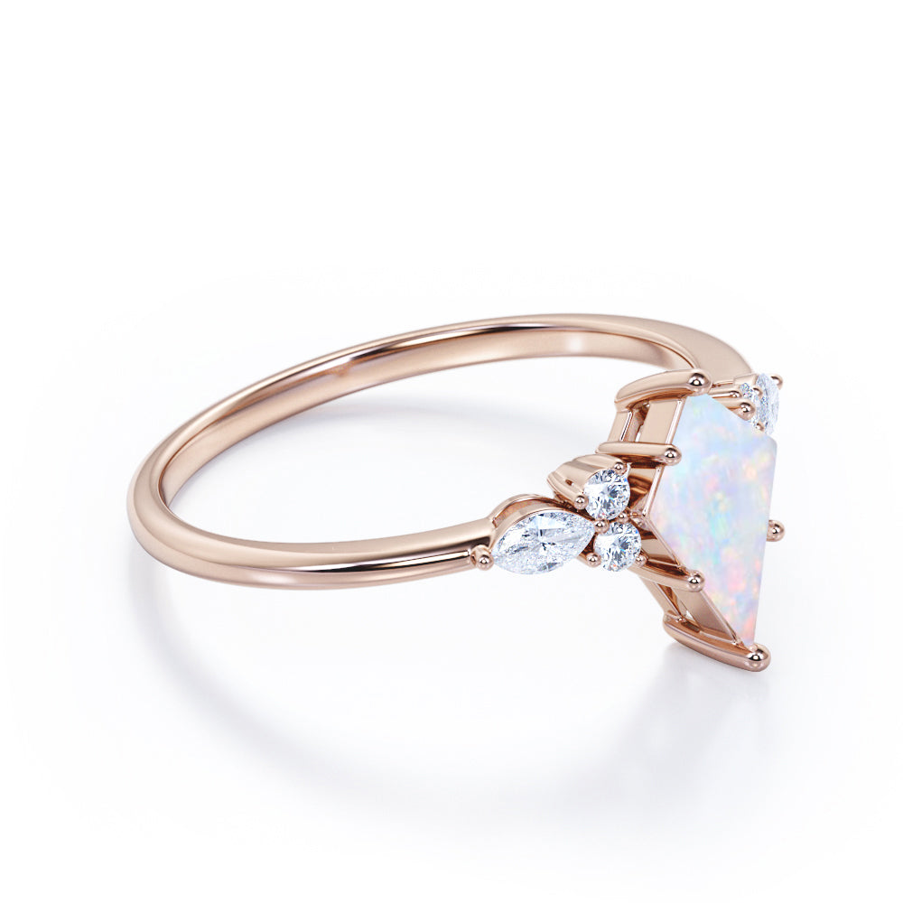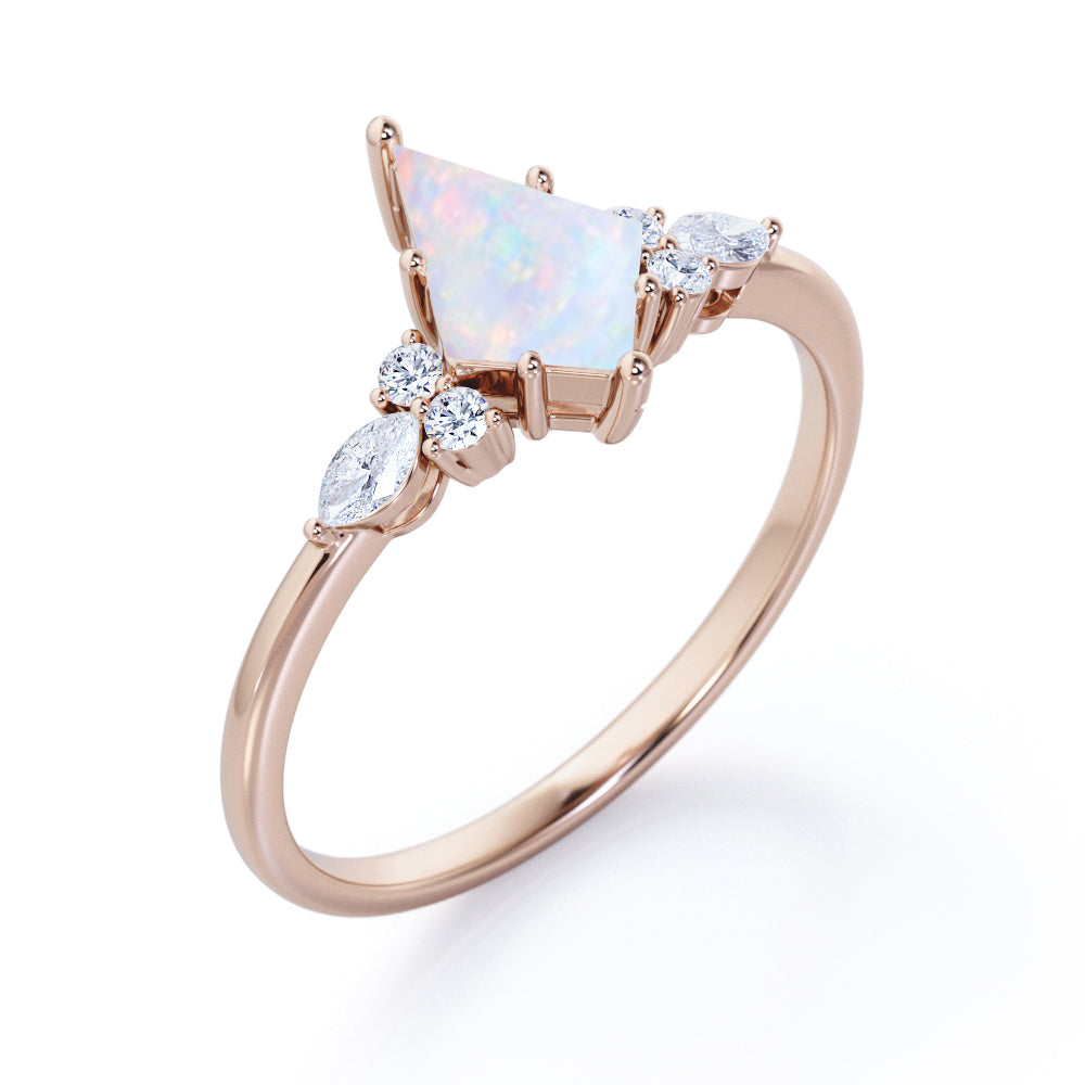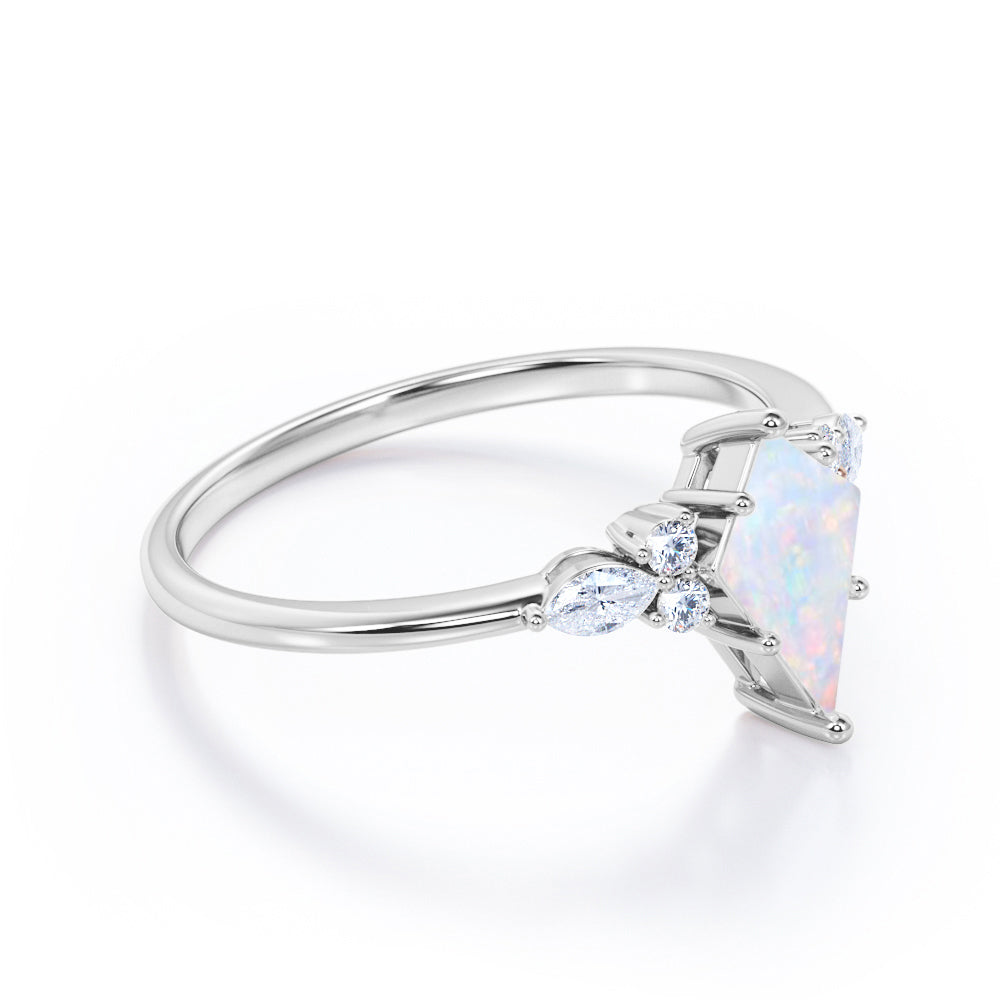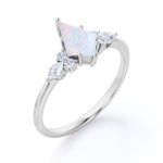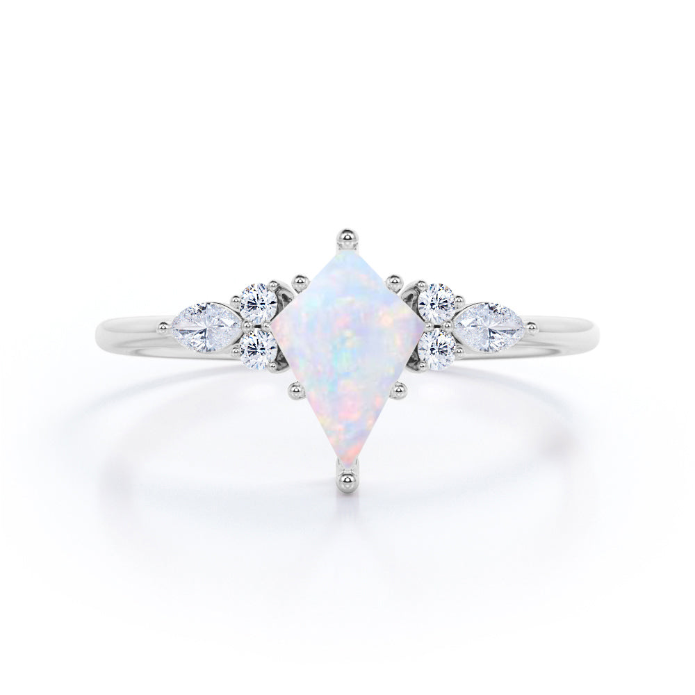 Asymmetric 1.30 Carat kite Shaped White Fire Opal And Diamond Seven Stone Engagement Ring In White Gold. Opals are not only known as the birthstone for October birthdates, but their tantalizing charm is also just irresistable. Opals have lustrous shine and brilliance to them. Nothing beats a distinctive kite shaped ring for the modern brides to be. Handmade with detailed attention by our old artisans, this asymmetric 1.30 carat kite shaped white fire opal and diamond seven stone engagement ring in white gold can also be customized to 18k Gold plating over silver, 10k Gold or 14k Gold as per your preference. It's hard to envision anything else with the transcendent light coming from that solitaire opal at the center. This kite shaped engagement ring features 1 carat solid white opal at the center and is adorned by trio set of dainty round cut white sparkling diamonds on either side.This seven stone ring will be a perfect fit for you love story as it is believed that joy enters the lives of people through the stone. The six prong holds the center opal in a basket setting over a plain white gold band.