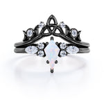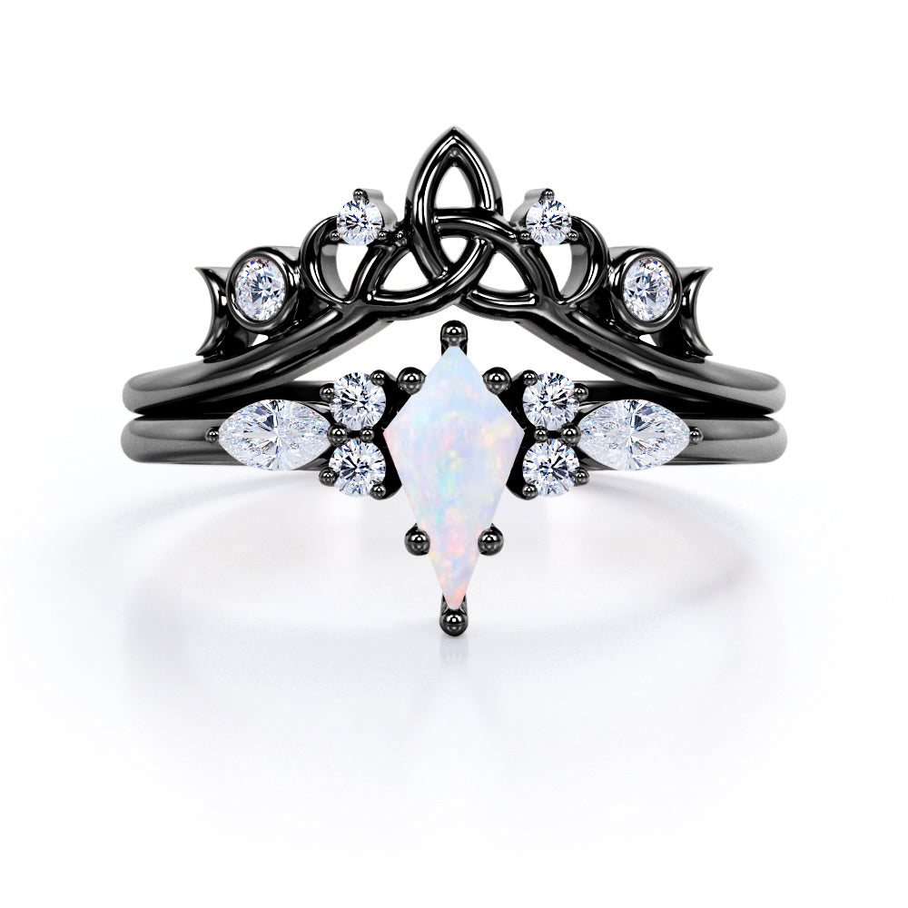Asymmetric 1 Carat Kite Shaped Ethiopian Lab Created Opal and diamond Seven Stone Tiara Style Wedding Ring Set In Black Gold. This one is for the bold bride seeking something unconventional. Almost 1 carats of light Lab Created Opal and white diamond sits upon this black gold band in a strikingly unique design. This seven stone wedding ring set comprises of an engagement ring and a matching wedding band to complete your ensemble. The engagement ring features 0.85 carat solitaire Lab Created Opal as the center stone which is held by six prongs and surrounded by three set of diamonds on wither side making it a seven stone engagement ring. The matching wedding band is V shaped and completely unique on it's own. The white diamonds of 0.15 carat on this amazing bridal set shines brilliantly set on a plain black gold band. Handmade with sincere dedication, this asymmetric 1 carat kite shaped Ethiopian Lab Created Opal and diamond seven stone tiara style wedding ring set in white gold can also be customized to 18k Gold plating over silver, 10k Gold or 14k Gold as per your wish.