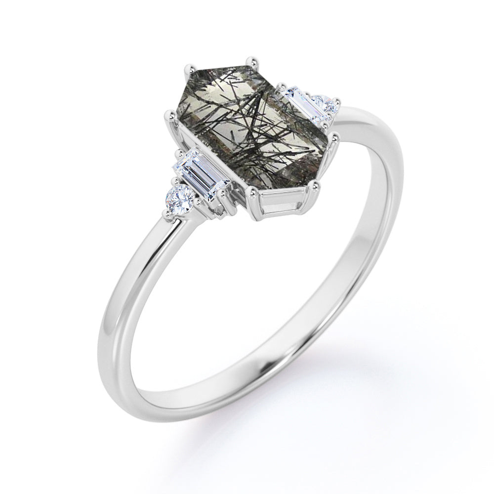 Asymmetric Six Prong Basket Set 1.15 Carat Hexagon Shaped Genuine Black Rutilated Quartz And Diamond Five Stone Engagement Ring In White Gold. With a design that’s decidedly chic and modern, this engagement ring has a geometric design. A hexagon shaped black rutilated quartz as the center stone gives this modern style a geometric twist. Made with an assortment of side diamonds in two bauguette and two round cuts and sizes, this exquisite piece is interesting to look at and often feels unexpected. One carat hexagon cut black rutilated quartz is held by six prongs is basket set at the center and is accompanied by 0.15 carat white diamonds as the side stone As all of our products are handmade by our well-experienced artisans, this asymmetric six prong basket set 1.15 carat hexagon shaped genuine black rutilated quartz and diamond five stone engagement ring in white gold can also be customized to 18k Gold plating over silver, 10k Gold or 14k Gold as per your preference. This five stone engagement ring will do all the wonders for you bringing love and hope in your life ahead.