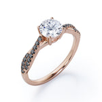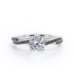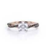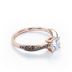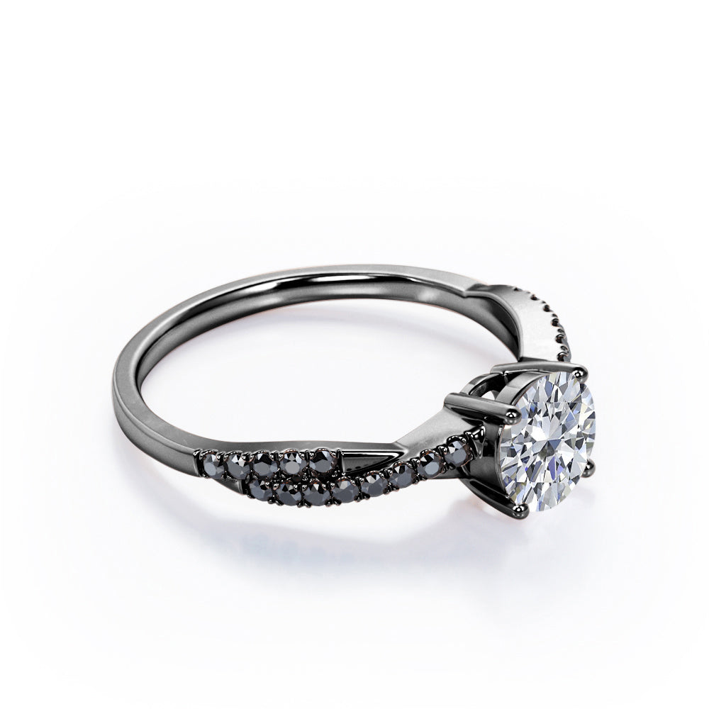 Capture your eternal love with this Basket Cathedral - 1.45 TCW Round Shape Moissanite with Lab Created Black Diamond - Crossover Pave Engagement Ring in Black gold. Professionally handcrafted into a fine round cut by our experts in lapidary, this affordable moissanite promise ring combines total 1.45 carat moissanite and lab-created black diamonds. Distinctive and extraordinary, this best moissanite ring is well-suited for those who are not quite into normal lifestyle. With naked eyes moissanites look, shine and feel exactly like diamonds. Reflective properties of this silver moissanite ring will absolutely enhance every style of its wearer. This moissanite fine jewelry is beautiful and accessible since it is available at an affordable price. Moissanites are the most popular alternative gemstone for diamonds while being at lower and more affordable price. For those who have no idea what to surprise your life partners, this moissanite band can definitely help you out. Also, this moissanite engagement ring can be customized, either in White gold, rose gold, yellow gold or black gold in 18k Gold over Silver, 10k and 14k gold metal options upon customer request. In regards to its hardness, moissanite is almost as hard as diamond which means that it is notably durable. Let's fulfill your love story with this moissanite promise ring and, surely, she will not regret it.