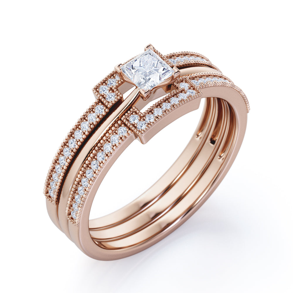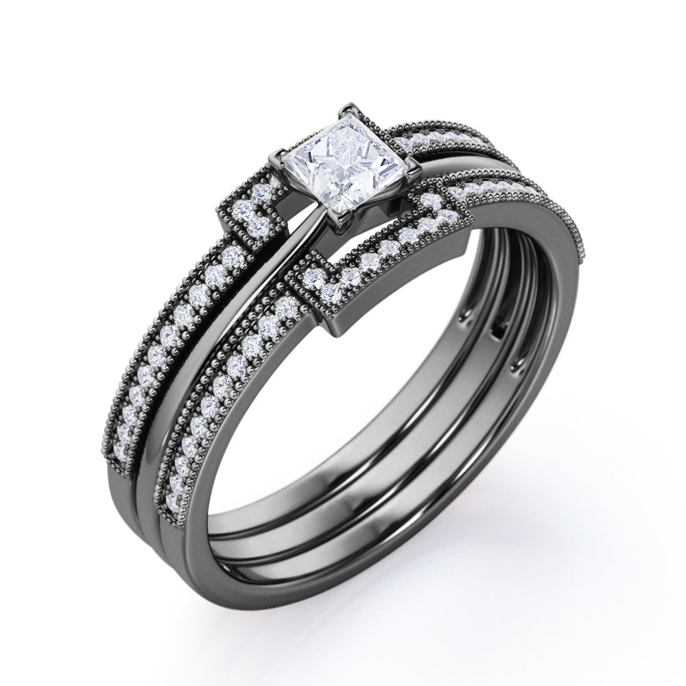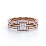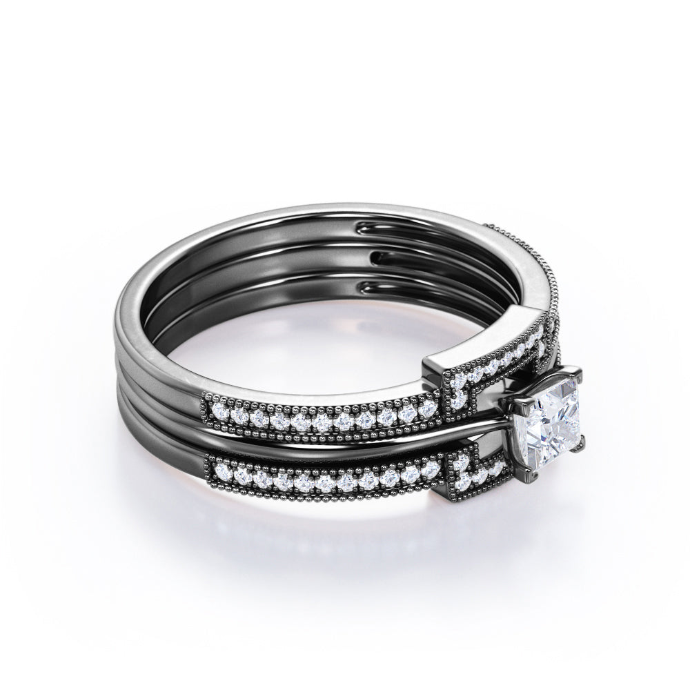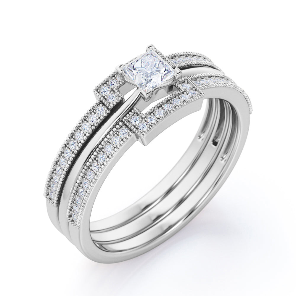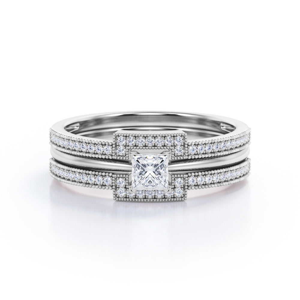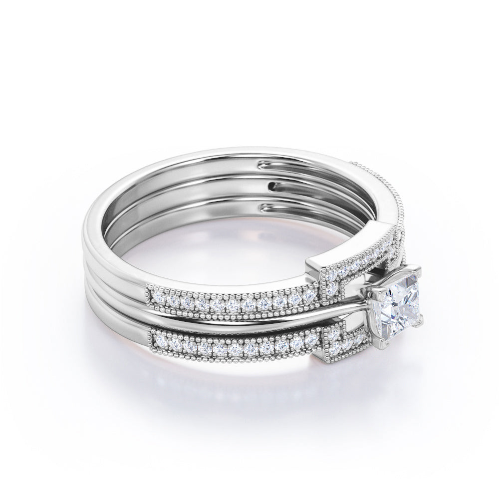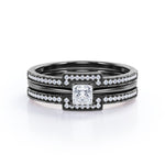Bead décor 1 carat Square Moissanite and Diamond Solitaire Trio Wedding Ring Set For Her in White Gold