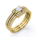 Elevated among all, Bead décor 1 carat Square Moissanite and Diamond Solitaire Trio Wedding Ring Set For Her in White Gold. The proposal ring features Moissanite as the center stone and diamond as side stone. Solitaire engagement ring is simple yet elegant. It is a timeless design that presents a single stone, emphasizing the classic simplicity and elegance of your lover's personality. Spectacular on its own with the extra sparkle from each revealing surface of the gemstone but also remarkable once combined with the mirror wedding band. The sole engagement ring lies between bead décor wrap rings. Wedding bands are destined to unite and match each other, illustrating the diamond frame that district engagement ring. This refined trio ring set comes in 18k gold over silver and 10k, 14k, 18k gold which can be customized to your choice and you can design it in white, black, yellow and rose gold.