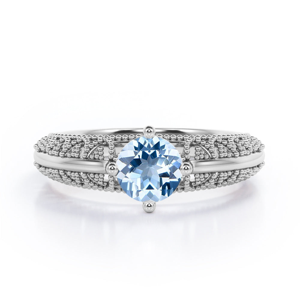 Beaded Art Deco 1 Carat Round Cut Aquamarine Solitaire Engagement Ring In White Gold