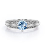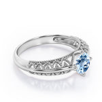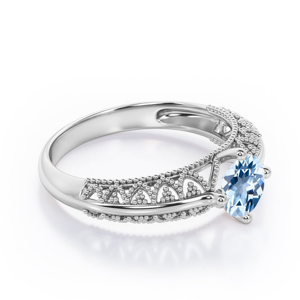 Beaded Art Deco 1 Carat Round Cut Aquamarine Solitaire Engagement Ring In White Gold. Channel your very own fairytale ending with this insanely gorgeous white gold solitaire aquamarine engagement ring. This classic beauty speaks for itself. This Victorian style engagement ring is filled with beaded work all over the band. The one carat solitaire aquamarine on this mystic piece illuminates great brilliance and unbelievable sparkle. The art deco work adds a certain grace and charm to this aquamarine engagement ring. Since all of our products are handmade with sincere love and devotion by our experienced artisans, this beaded art deco 1 carat round cut aquamarine solitaire engagement ring in white gold can also be customized into 18k gold over silver, 10k Gold or 14k Gold in white gold, black gold or yellow gold as per your preference.