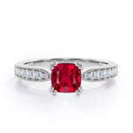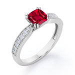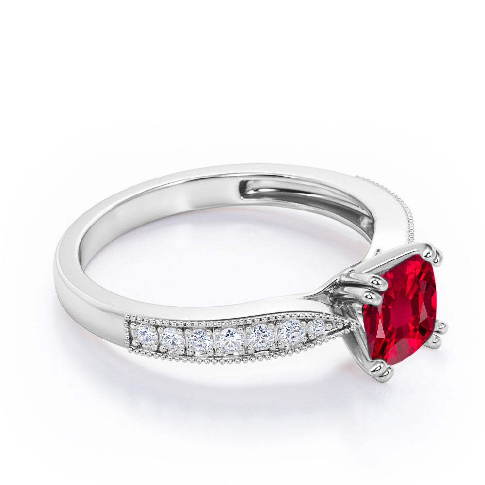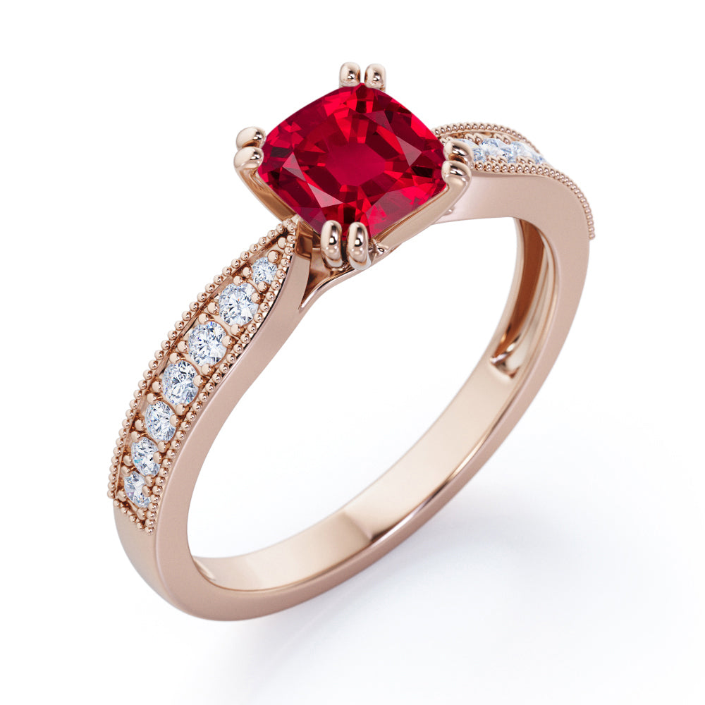 Beaded Eight Prongs 1.25 Carat Cushion Cut Lab-Created Ruby And Diamond Antique Milgrain Engagement Ring In Rose Gold. Own this splendid Ruby ring which displays one of the most remarkable sparkle and stand out from the rest. This flawless engagement ring will be a perfect match for those who are looking for beautiful, classic, and unique pieces of fine jewelry. One carat cushion cut ruby stone sits in eight prongs at the center radiating its own brilliance and is surrounded by 0.25 carat of white sizzling diamonds. The pave set diamonds in a rose gold band illuminates amazing brilliance. Handmade with utmost sincerity, this beaded eight prongs 1.25 carat cushion cut ruby and diamond antique milgrain engagement ring in rose gold can also be customized to 18k Gold plating over silver,10k Gold or 14k Gold as you desire. Please note that if the ring is made over silver, the side stone will be moissanite and if it is made on gold, diamond will be employed as the side stone.