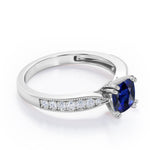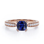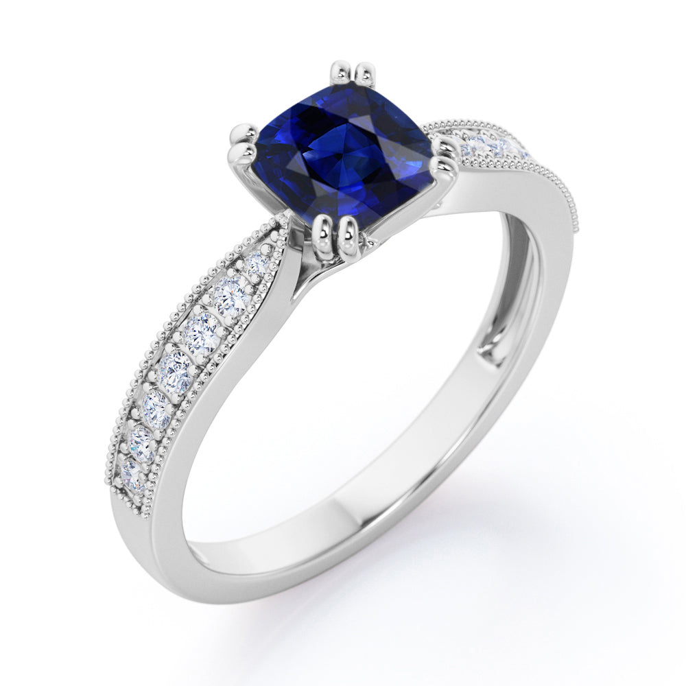 Beaded Eight Prongs 1.25 Carat Cushion Cut Sapphire And Diamond Antique Milgrain Engagement Ring In Rose Gold. Own this splendid Sapphire ring which displays one of the most remarkable sparkle and stand out from the rest. This flawless lengagement ring will be a perfect match for those who are looking for beautiful, classic, and unique pieces of fine jewelry. One carat cushion cut sapphire stone sits in eight prongs at the center radiating its own brilliance and is surrounded by 0.25 carat of white sizzling diamonds. The pave set diamonds in a rose gold band illuminates amazing brilliance. Handmade with utmost sincerety, this beaded eight prongs 1.25 carat cushion cut sapphire and diamond antique milgrain engagement ring in rose gold can also be customized to 18k Gold plating over silver,10k Gold or 14k Gold as you desire. Please note that if the ring is made over silver, the side stone will be moissanite and if it is made on gold, diamond will be employed as the side stone.
