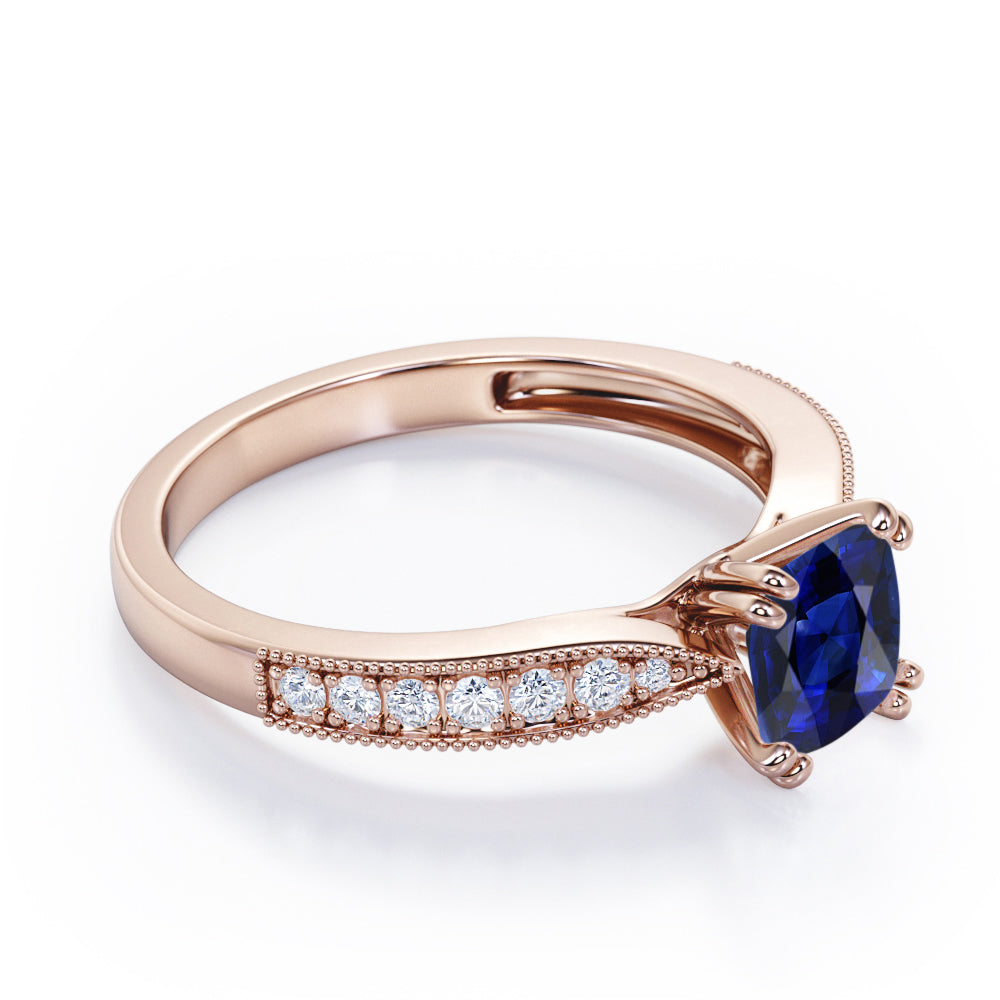Beaded Eight Prongs 1.25 Carat Cushion Cut Sapphire And Diamond Antique Milgrain Engagement Ring In Rose Gold