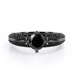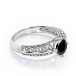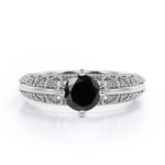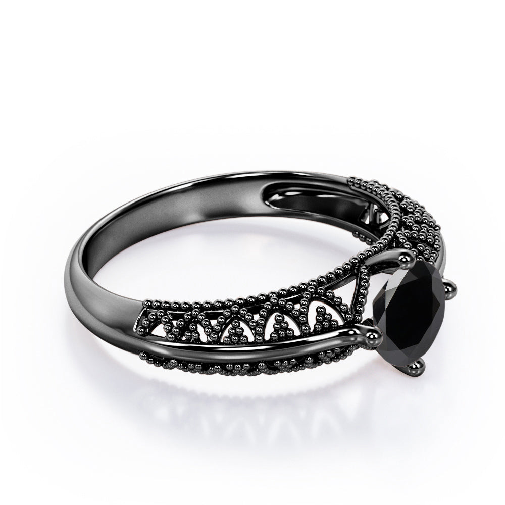 Beaded Four Prong 1 Carat Round Cut Black Diamond Solitaire Vintage Engagement Ring In White Gold. Pure elegance, right this way. For a vintage aesthetic and one-of-a-kind feel, we recommend this standout engagement ring with art deco flair. Between the vintage beaded edges and the perfectly placed round cut black diamond, this engagement ring is the epitome of timeless. This solitaire black diamond ring in white gold features 1 carat black diamond in the center. The detailed art deco work in the band lends a vintage appeal to this elegant engagement ring. You will surely be intrigued by this regal piece with beaded work all over the band. You are absolutely going to love this. Since all of our products are handmade with sincere love and devotion by our experienced artisans, this beaded four prong 1 carat round cut black diamond solitaire vintage engagement ring in white gold can also be customized into 10k Gold or 14k Gold in white gold, black gold or yellow gold as per your preference.
