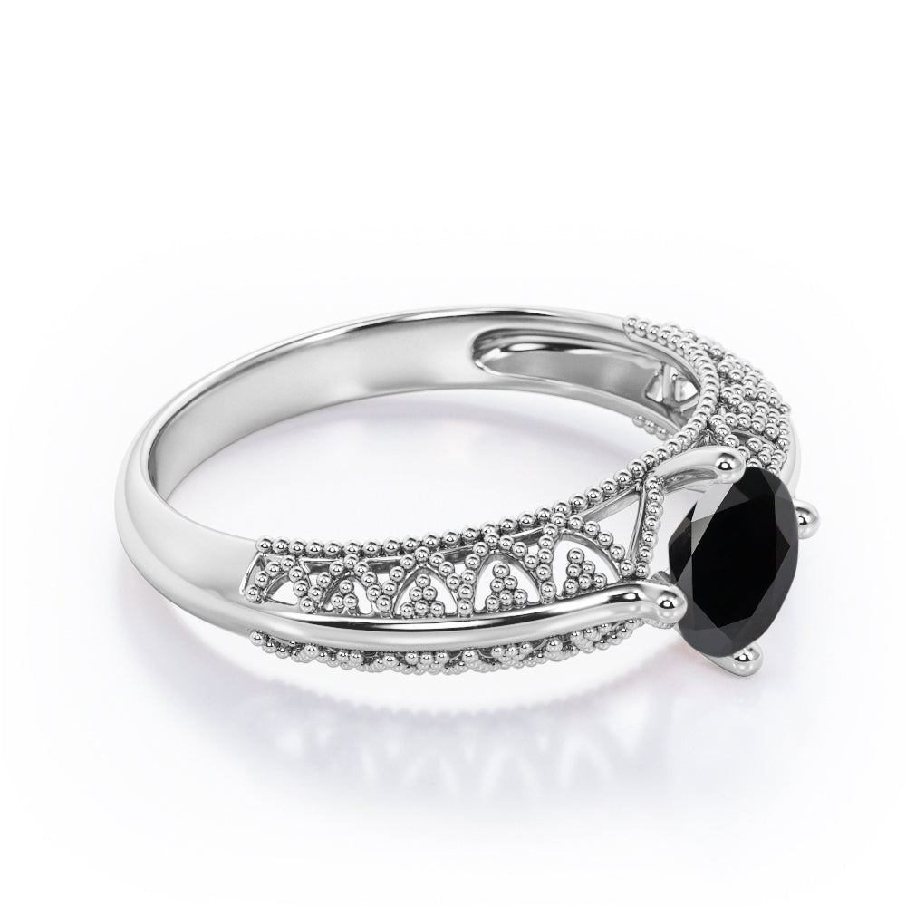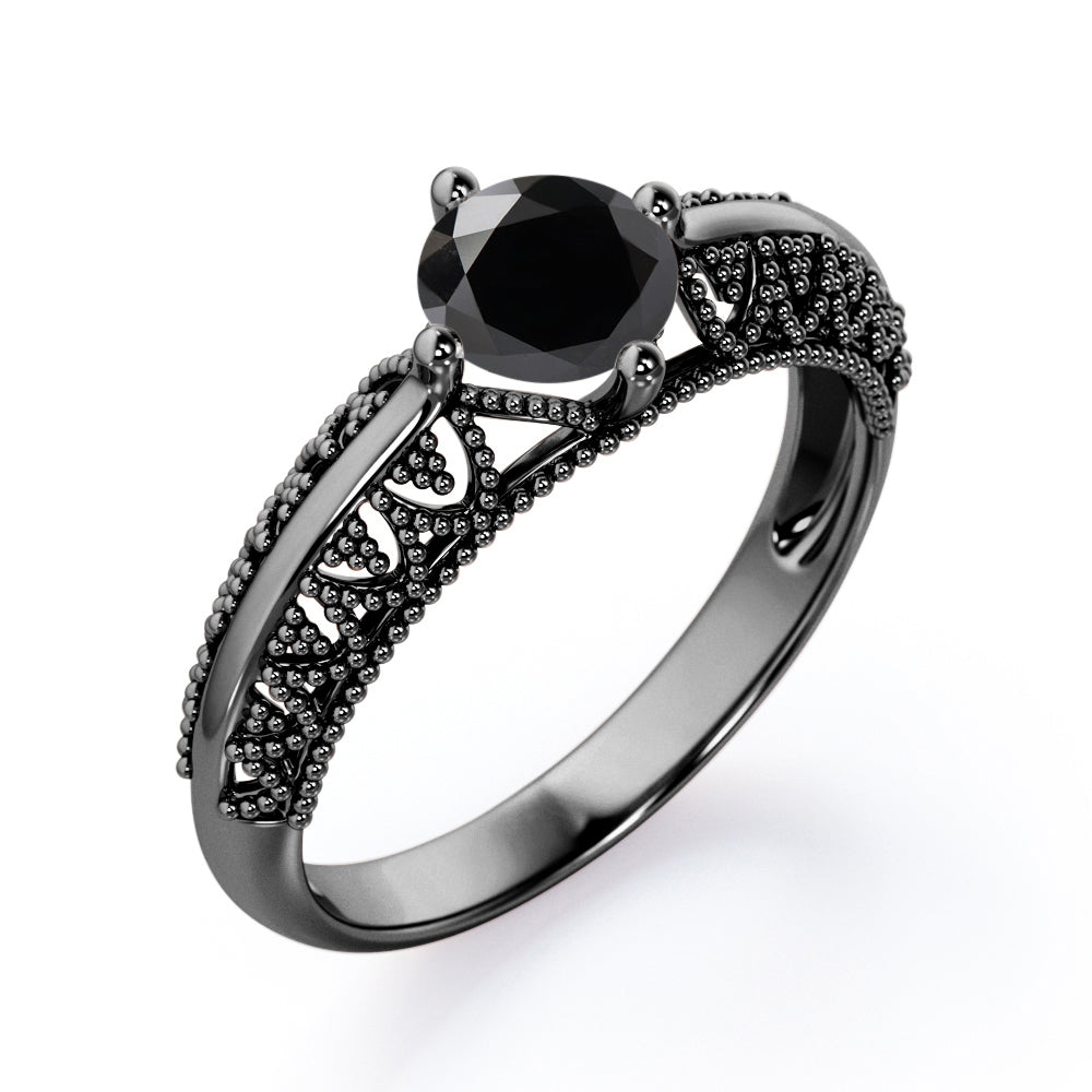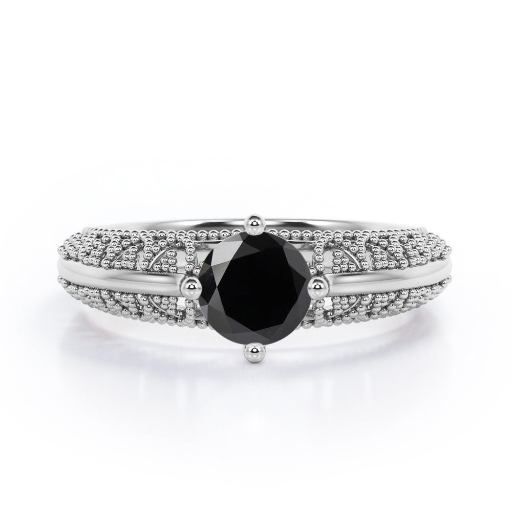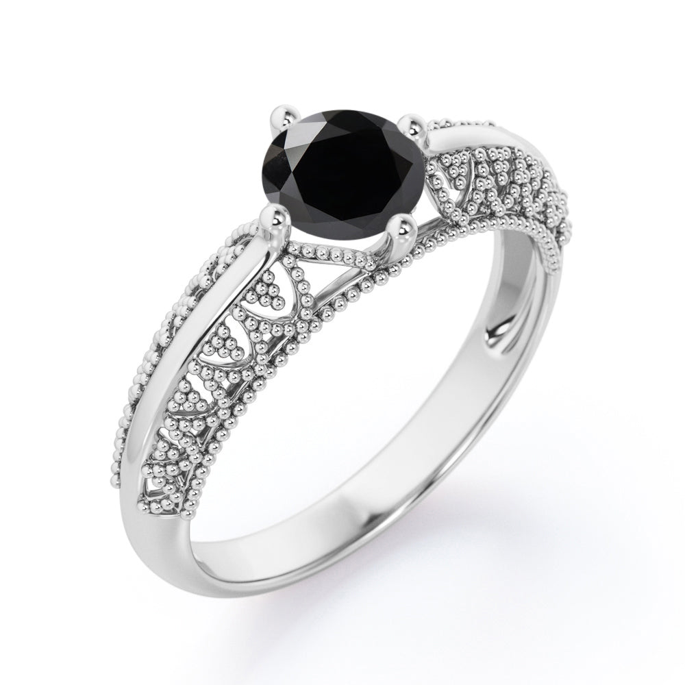 Beaded Four Prong 1 Carat Round Cut Black Diamond Solitaire Vintage Engagement Ring In White Gold