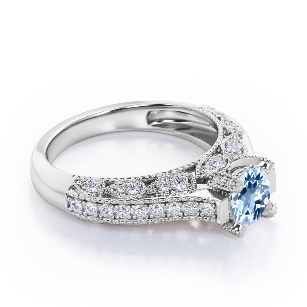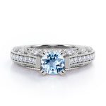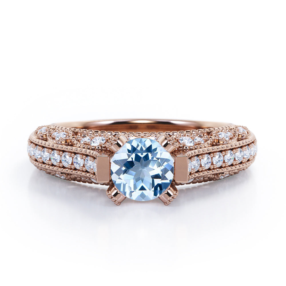 Beaded Four Prongs 1.40 Carat Round Cut Aquamarine And Diamond Vintage Art Deco Engagement Ring In Rose Gold. Ornament your love story with this stunning vintage piece of aquamarine and diamond engagement ring inviting more happiness and joy into your life. This brilliant round cut aquamarine engagement ring features 1 carat sparkling aquamarine as the center stone in a classic prong setting which exhibits great brilliance and unbelievable sparkle and 0.40 carat of sparkling petite white diamonds in the band engraved with modern art deco and vintage milgrain craftwork in rose gold band. This beaded four prongs 1.40 carat round cut aquamarine and diamond vintage art deco style engagement ring in rose gold can also be customized into 18k Gold plating over silver, 10k Gold or 14k Gold as per your preference as all our rings are handmade by our experienced artisans. Please note that if the ring is made over silver, the side stone will be moissanite and if it is made on gold, diamond will be employed as the side stone.
