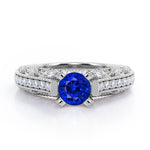 Beaded Four Prongs 1.40 Carat Round Cut Sapphire And Diamond Vintage Art Deco Engagement Ring In Rose Gold. Ornament your love story with this stunning vintage piece of sapphire and diamond engagement ring inviting more happiness and joy into your life. This brilliant round cut sapphire engagement ring features 1 carat sparkling sapphire as the center stone in a classic prong setting which exhibits great brilliance and unbelievable sparkle and 0.40 carat of sparkling petite white diamonds in the band engraved with modern art deco and vintage milgrain craftwork in rose gold band. This beaded four prongs 1.40 carat round cut sapphire and diamond vintage art deco style engagement ring in rose gold can also be customized into 18k Gold plating over silver, 10k Gold or 14k Gold as per your preference as all our rings are handmade by our experienced artisans. Please note that if the ring is made over silver, the side stone will be moissanite and if it is made on gold, diamond will be employed as the side stone.