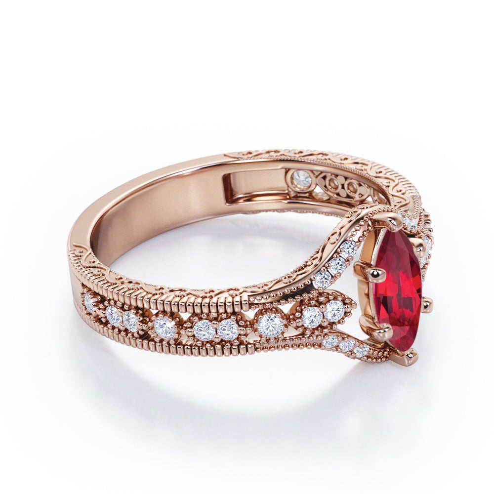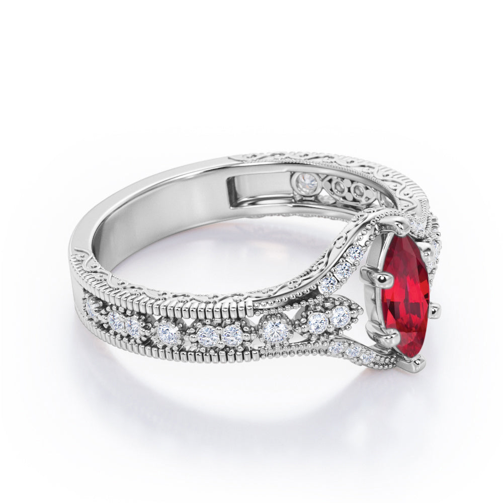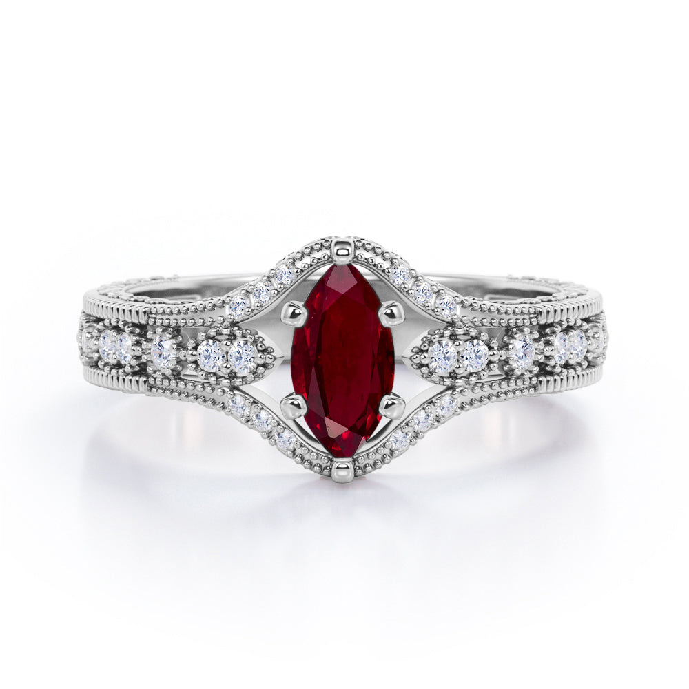Beaded Framed 1.25 Carat Marquise Cut Lab Ruby And Diamond Vintage Filigree Engagement Ring In White Gold