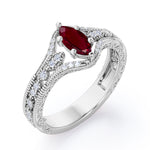 Beaded Framed 1.25 Carat Marquise Cut Lab Ruby Vintage Filigree Engagement Ring In White Gold. Looking for something extra and distinctive to stand out from others? Then look no further, presenting our unique marquise cut Lab Ruby and diamond engagement ring which might be exactly what you are looking for. This vintage engagement ring features 1 carat marquise shaped Lab Ruby set in six prongs and 0.25 carat white sizzling diamonds including the band in white gold. This vintage inspired engagement ring features antique art deco and lattice filigree art in the band. The pave set diamonds in the wedding band radiates unbelievable sparkle and great brilliance. This beaded framed 1.25 carat marquise cut Lab Ruby vintage filigree engagement ring in white gold can also be customized to 18k Gold plating over silver, 10k Gold or 14k Gold or 18k Gold as per your choice. So hurry up and make it all yours forever by simply pressing the add to cart button below. Please note that if the ring is made over silver, the side stone will be moissanite and if it is made on gold, diamond will be employed as the side stone.