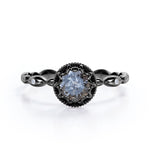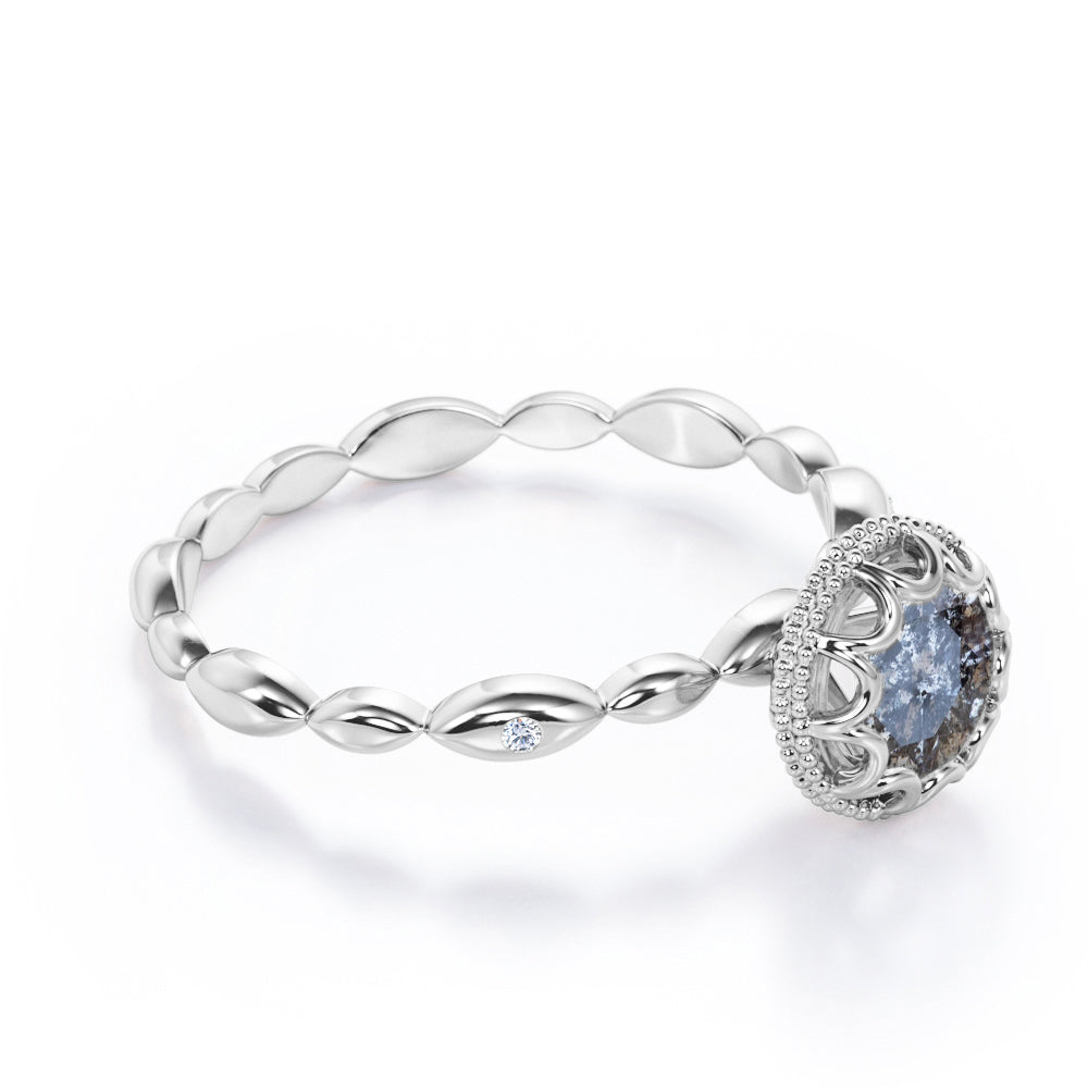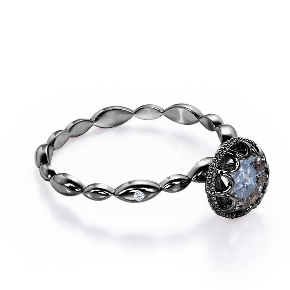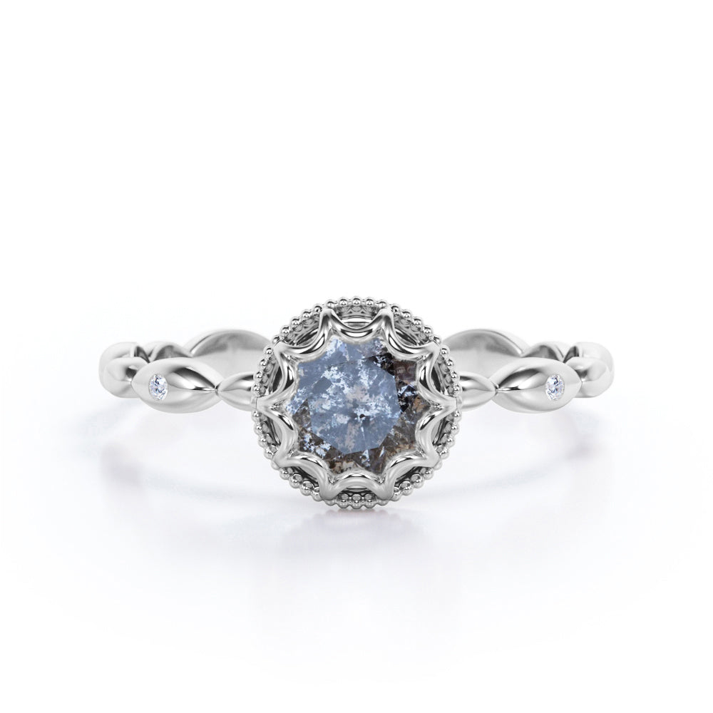 Beaded Halo 0.35 Carat Round Cut Icy Grey Salt and Pepper Diamond Three Stone Engagement Ring In White Gold. If you are looking for a modern ring with a vintage twist, then this design is an exceptional option. The round shaped natural icy salt and pepper diamond is encircled with a double layer halo of beaded filgiree edges and framed by a star like curly halo in a white gold band. This vintage ring features salt and pepper diamond of 0.33 carat and 0.02 carat of two tiny diamonds on the either sides.This beaded halo 0.35 carat round cut icy grey salt and pepper diamond three stone engagement ring in white gold can also be handmade in 18k Gold plating over silver, 10k Gold or 14k Gold or as per your desired choice. Most suitable for setting with your splendid round cut center diamond, the marquised shaped design on the band makes it stand apart from the rest! Finding the right engagement rings style for your intended can be a challenge, but our marvelous assortment of elegant settings and 100% natural diamonds diamonds makes finding the perfect ring easy!