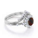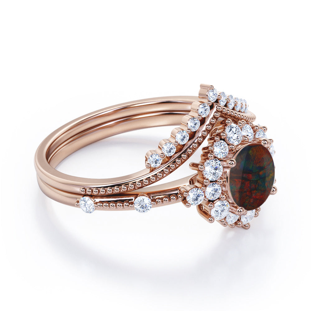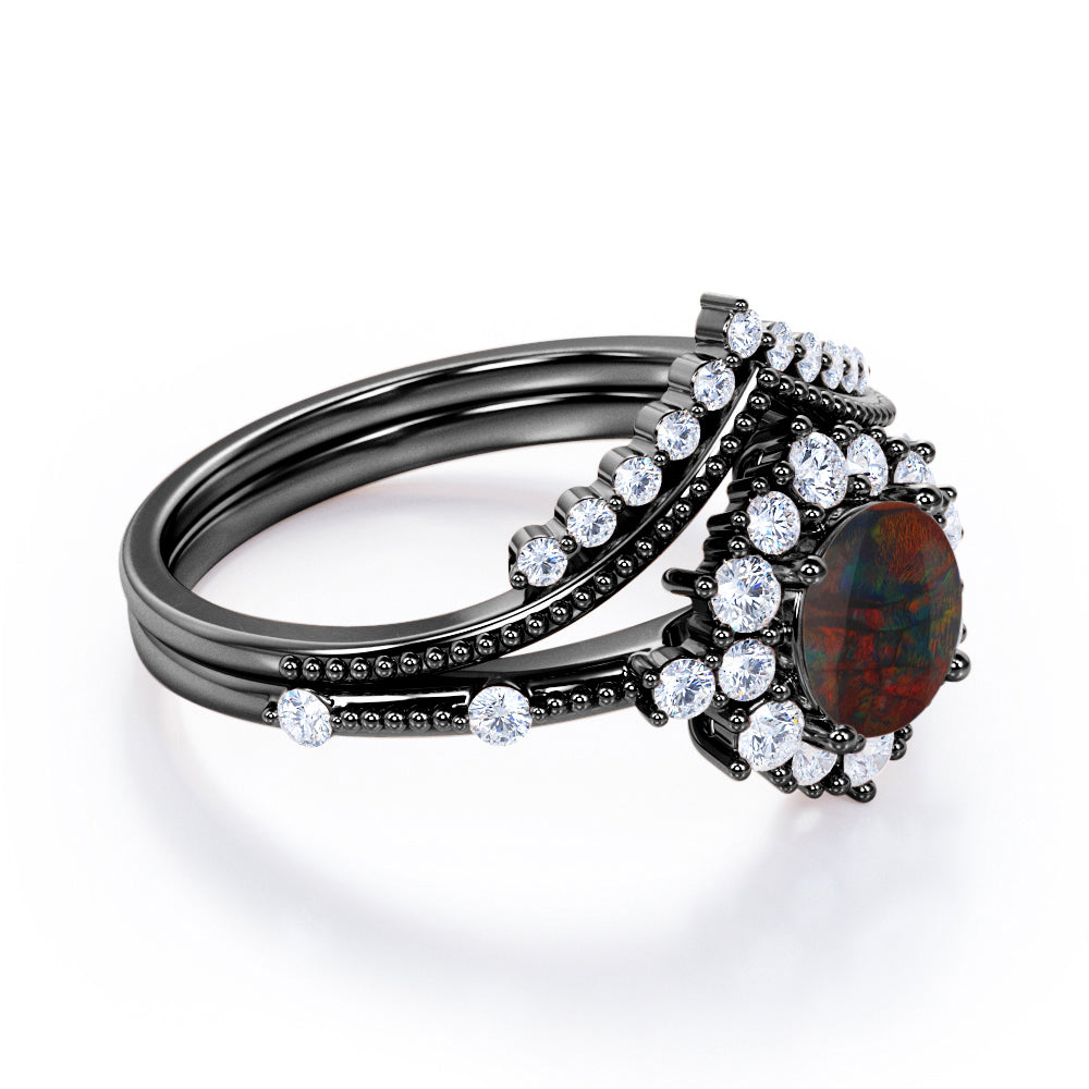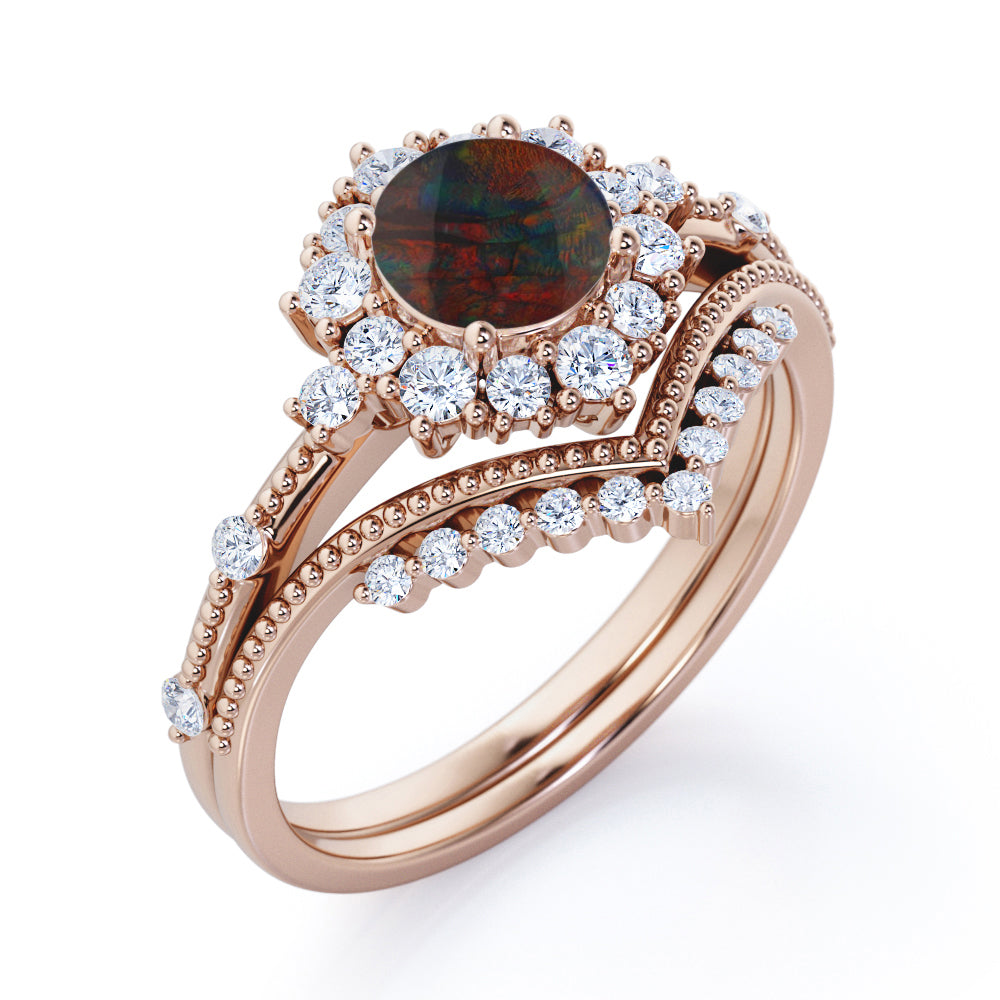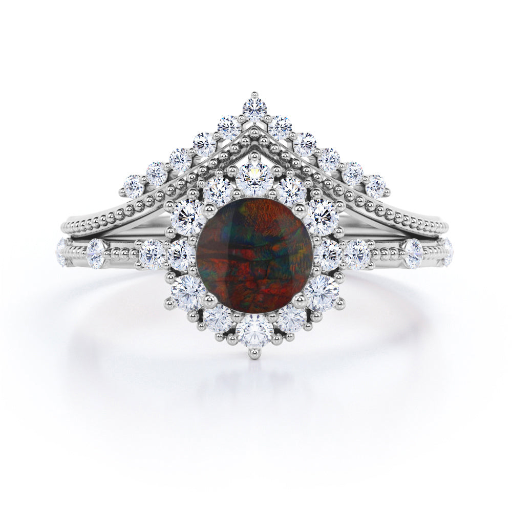 Beaded Vintage Style 1.40 Carat Round Cut lab created Black Lab Created Opal And Diamond Halo Tiara Design Bridal Set In White Gold. This gorgeous vintage find is oh-so romantic. This vintage bridal set features an exquisite design for an equally impressive gemstone. Set in graceful white gold, the vivid black Lab Created Opal possesses a mesmerising play-of-colour with hues of green, blue and red. The gracious black Lab Created Opal ring is a truly one-of-a-kind piece that expresses your individuality.This chevron ring featuring a round cut 1 carat lab Lab Created Opal and 0.40 carat of glistening diamonds inclusive of a matching tiara design wedding band looks like a precious heirloom. A round black Lab Created Opal center stone is framed with a halo of diamonds, adding to the illusion of a larger center stone. The beaded motif detailing gives the touch of vintage feel to this bridal set which you are going to love for sure. This beaded vintage style 1.40 carat round cut lab Lab Created Opal and diamond halo tiara design bridal set in white gold can also be customized into 18k Gold plating over silver, 10k Gold or 14k Gold as per your preference.