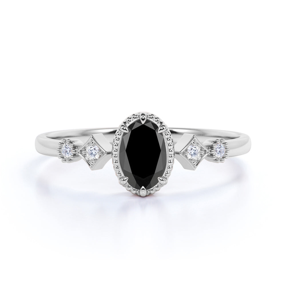 Beautiful 1.10 Carat Oval Shape Lab Black Diamond and 5 Stone Milgrain Engagement Ring in White Gold