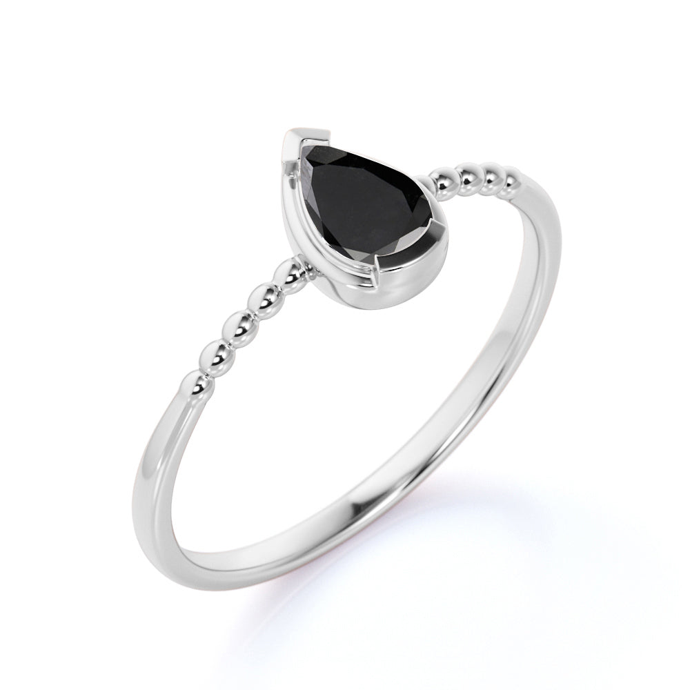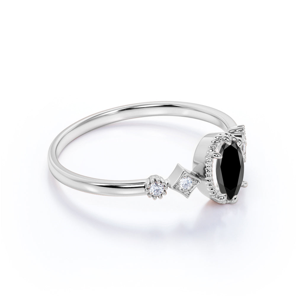 This trendy black diamond ring is so beautiful and durable despite its dainty look. Perfect for any occasion, birthday gift, anniversary gift, promise ring or just a simple gift for your loved ones. This black diamond ring features an approximately 1 carat oval cut lab created black diamond, surrounded by .10 carat authentic diamond accent, for a total weight of 1.10 carats.
