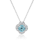 Experience the enchantment of our Beautiful 1.15 Carat Flower Halo Round Shaped - Blue Topaz - December Birthstone Pendant Necklace in 18K White Gold over Silver. This exquisite halo pendant necklace combines affordability, durability, and versatility, ensuring a truly captivating accessory. Featuring a mesmerizing cluster of cubic zirconia stones with a total carat weight of 1.15 Carat arranged in a distinctive formation, it resembles a unique 4 petal flower necklace. Each stone is meticulously cut into the round brilliant cut which is known as the best cut for cubic zirconia, delivering unparalleled brilliance and sparkle. The floating necklace design imparts an ethereal quality as if the pendant is effortlessly suspended in mid-air, elevating its allure. The expert craftsmanship of this cubic zirconia cluster chain is at a much more accessible price. Versatile and timeless, this pendant necklace is perfect for both formal occasions and everyday wear. Its classic design ensures it complements any outfit, adding a touch of glamour and sophistication.|Total Carat Weight (All Stones): 1.15 Carat|Main Gemstone Type: Cubic Zirconia|Gemstone Shape: Round Cut|Gemstone Color: Near Colorless|Gemstone Clarity: VS|Metal Type: 18K White Gold Plating over Sterling Silver|Birthstone Month: December