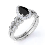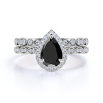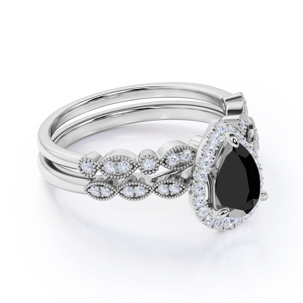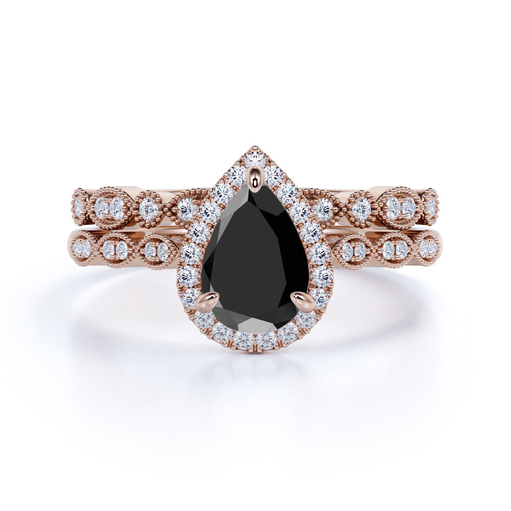 Beautiful 1.75 Carat Pear cut Lab Black Diamond Halo Wedding Ring Set in Rose Gold