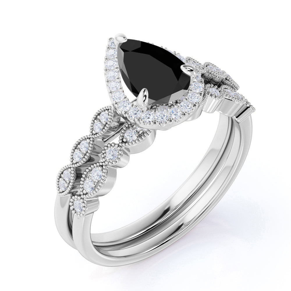 Beautiful 1.75 Carat Pear cut Black Diamond Halo Wedding Ring Set in Rose Gold. Wonderful black Diamond affordable wedding ring set with engagement ring and wedding bands showcases 1 carat perfect lab created black diamond and 0.75 carat glittering diamonds and is made in solid 10k Rose Gold. Handmade by our skilled artisan jeweler, this piece is truly one of a kind. And as always, the order comes with our 30 DAYS FULL REFUND policy, GUARANTEED DELIVERY within 5 Days, and in a BEAUTIFUL Jewelry Ring Box.