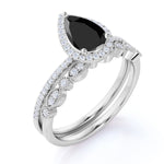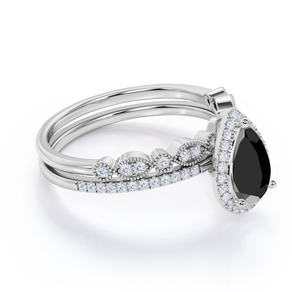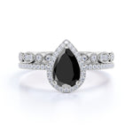 Beautiful 1.75 Carat Pear cut Lab Black Diamond Halo Wedding Ring Set in White Gold