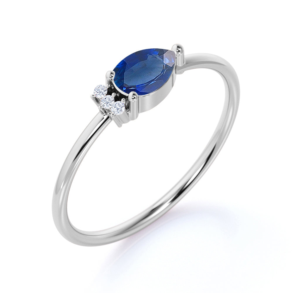 Beautiful East West Pear Navy Blue Sapphire and Diamond Minimalist Engagement Ring in White Gold