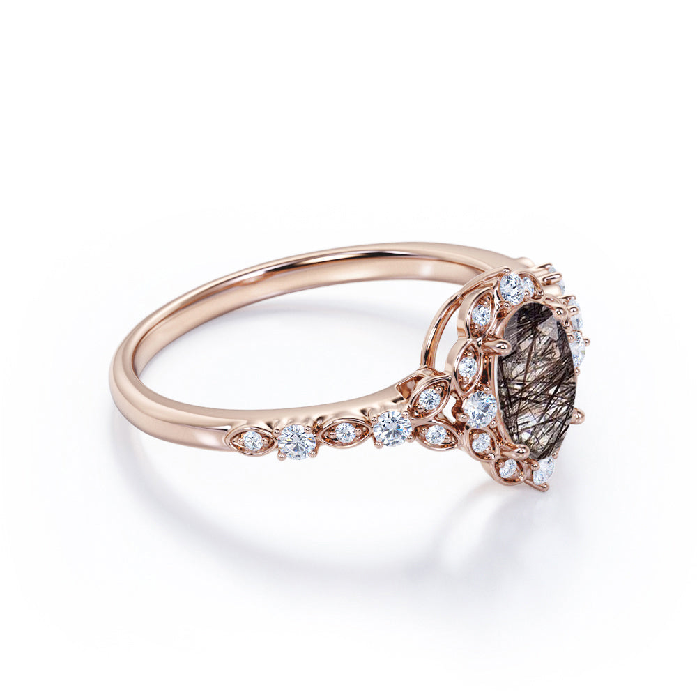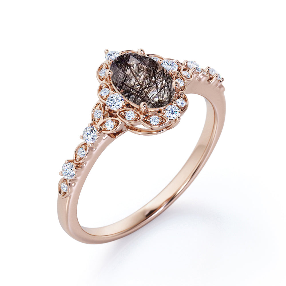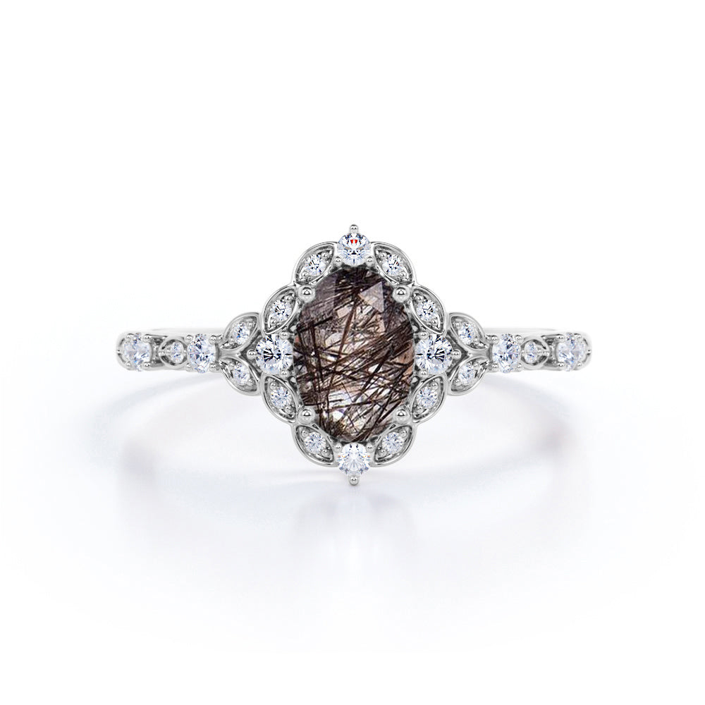 Create an incredibly beautiful look on her finger with this Beautiful Flower 1.50 Carat Oval Cut Natural Druzy Brown Rutile Clear Quartz and Diamond Bezel Art Deco Engagement Ring. This beautiful floral design solid dendritic rutilated quartz engagement ring features 1 carat oval cut real rutilated quartz and .50 carat real side diamond for gold ring and moissanite for silver ring. This bezel set art deco engagement ring can be customized to either 10k, 14K and Gold over Silver and either Black Gold, Rose Gold, White Gold or Yellow Gold. Also, as your satisfaction is our most priority, we will do our best to have your handmade jewelry be carefully and beautifully crafted by our expert jewelers. The order also comes with a 30-day full refund policy. This clear crystal with black needle inclusions ring will surely be a perfect gift for your significant other. It is well-known for its powerful healing properties. This tourmalinated black rutilated quartz is believed to be a protection against the ill thoughts of others. Own this ring which displays a combination of quartz and rutile that creates an amazing vibration and stand out from the rest. This rutilated crystal quartz ring is a very perfect alternative to those traditional ring because of its incredibly beautiful needle inclusions. Create a fascinating look on your finger with this black rutilated crystal quartz ring which is available in both solid gold and sterling silver. While many gemstones are most valuable when they contain few or no inclusions, rutilated quartz is actually prized because of its unique inclusions. Being an uplifted stone, this rutilated quartz ring infuses joy into your life and surrounding environment. Impress your special someone with this beautiful and affordable natural black hair rutilated quartz ring. With its mesmerizing patters of colors and inclusions, this rutilated quartz ring will enchant your special someone with gracefulness.