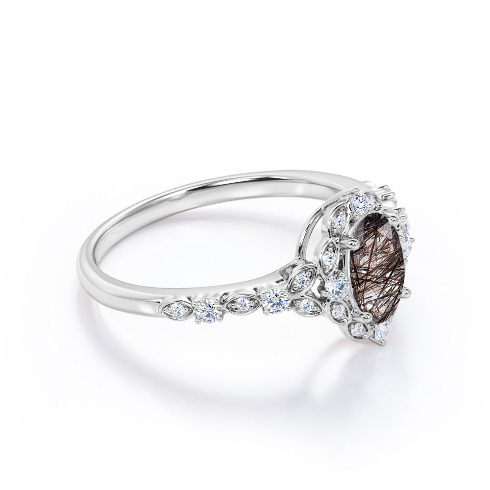 1.50 ct Oval Black Rutilated Quartz Bezel Art Deco Engagement Ring