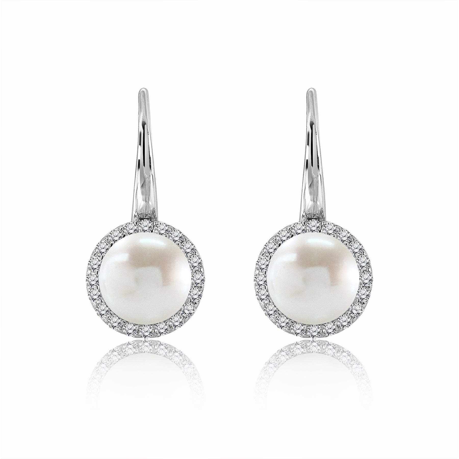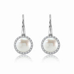 Beautiful Halo Round Pearl Dangling Earrings in 18k White Gold over Silver