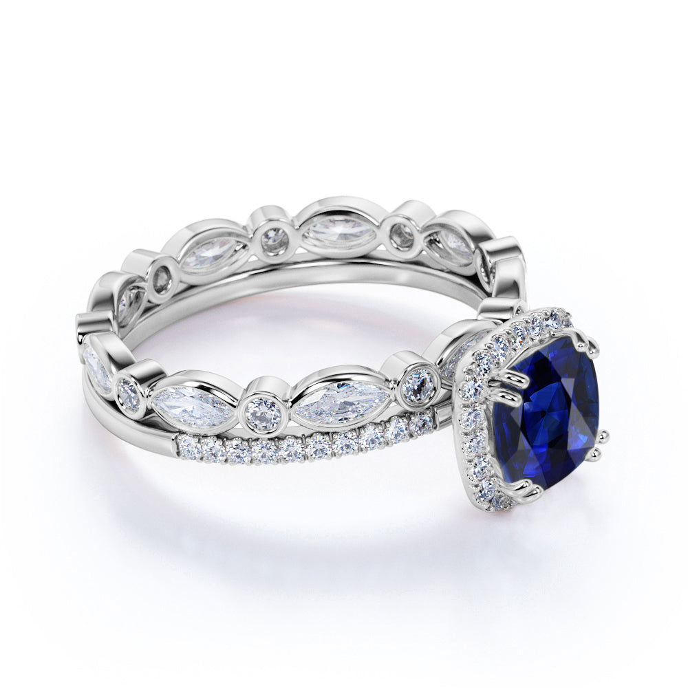 Bestselling 1.50 Carat cushion cut Blue Sapphire and Diamond Engagement Wedding Ring Set