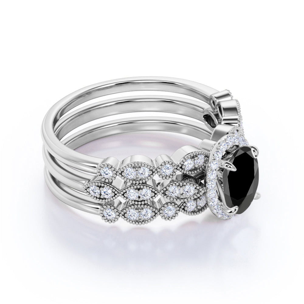 Bestselling 2 Carat Oval cut Black Diamond Trio Wedding Ring Set in White Gold. Handmade vintage design sparkling black Diamond bridal ring set, perfect for her, highlights 1 carat perfect lab created black diamond and 1 carat glittering diamonds and is made in solid 10k White Gold. The piece is handmade, for a refreshingly beautiful and unique look, away from the ordinary. And as always, the order comes with our 30 DAYS FULL REFUND policy, GUARANTEED DELIVERY within 5 Days, and in a BEAUTIFUL Jewelry Ring Box.