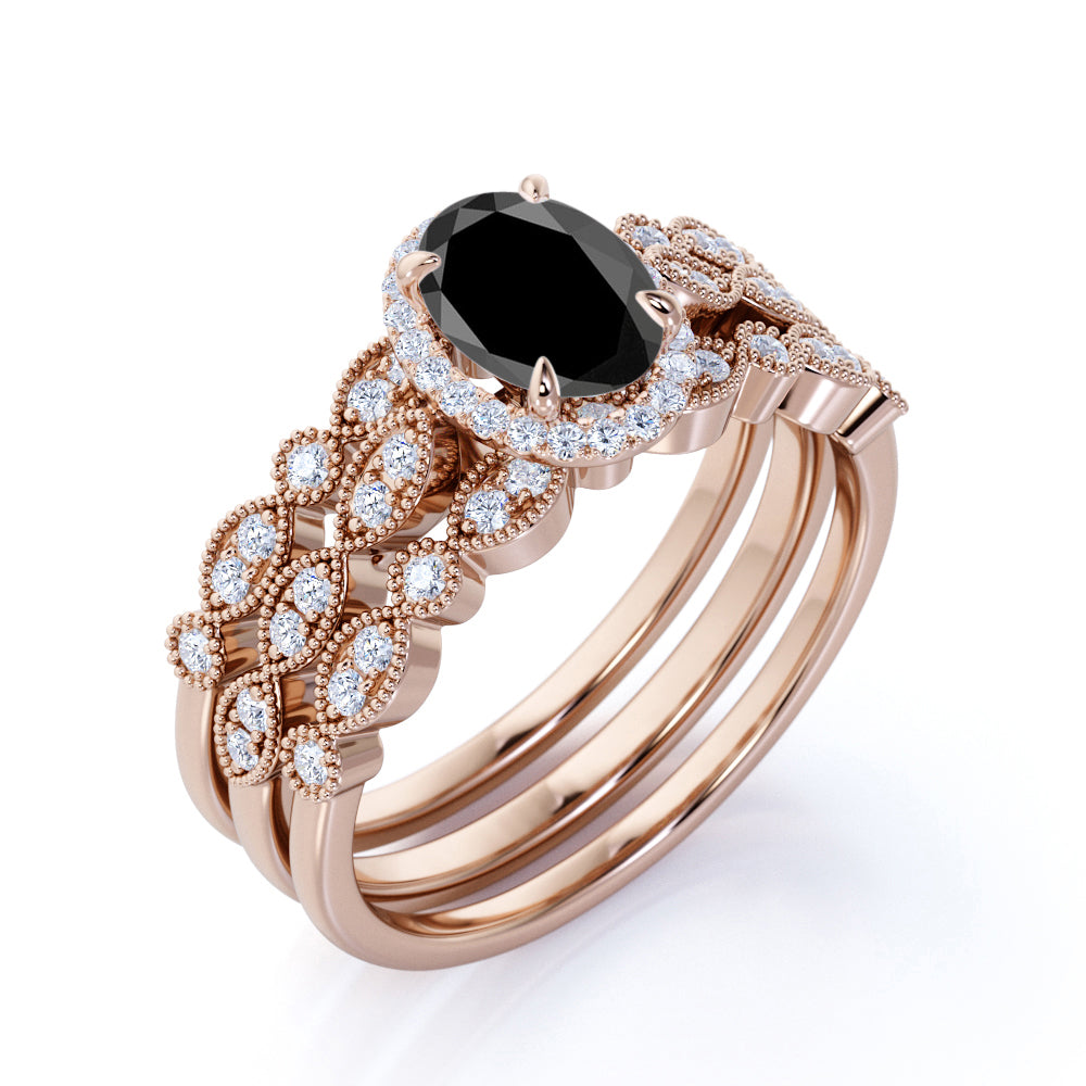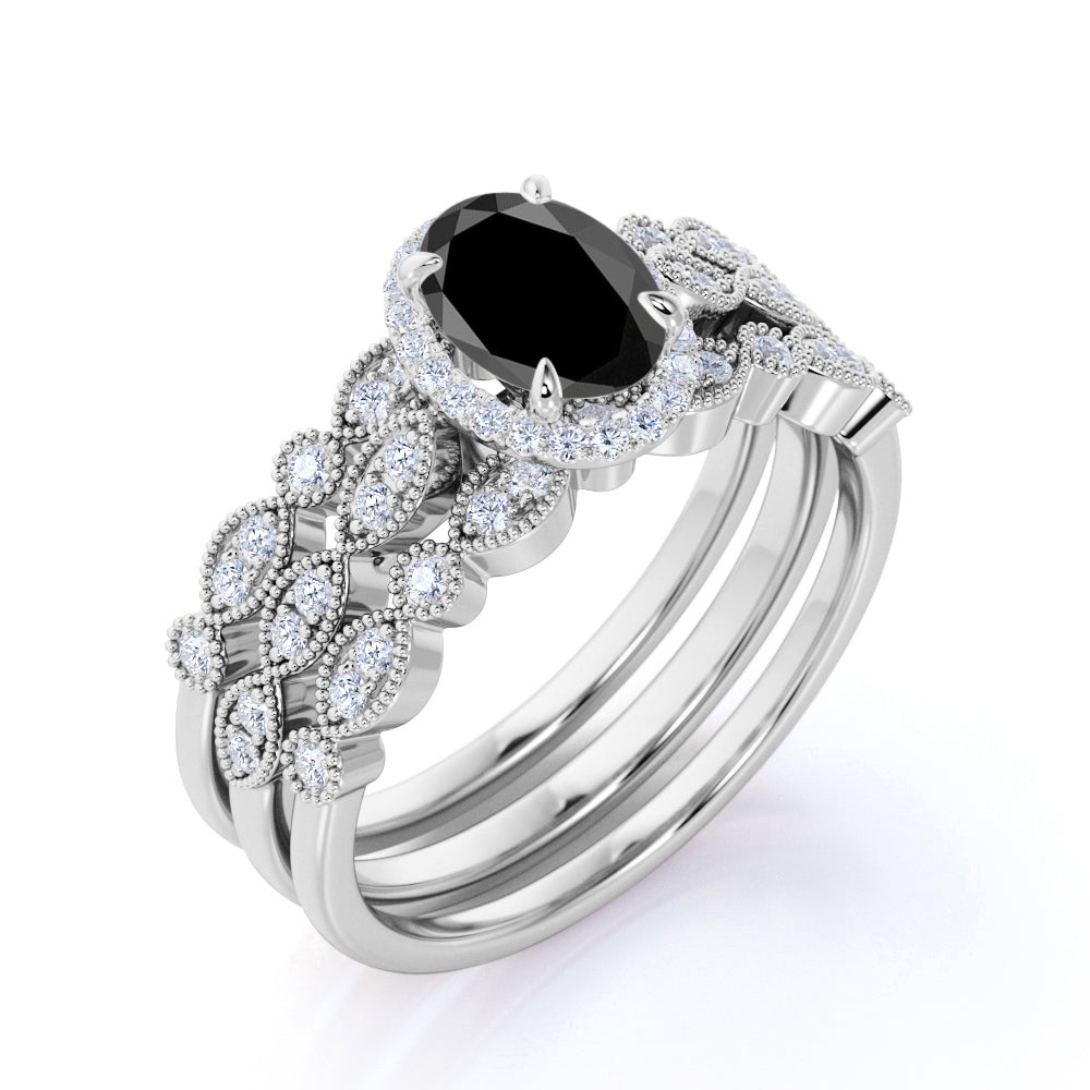 Bestselling 2 Carat Oval cut Black Diamond Trio Wedding Ring Set in White Gold. Handmade vintage design sparkling black Diamond bridal ring set, perfect for her, highlights 1 carat perfect lab created black diamond and 1 carat glittering diamonds and is made in solid 10k White Gold. The piece is handmade, for a refreshingly beautiful and unique look, away from the ordinary. And as always, the order comes with our 30 DAYS FULL REFUND policy, GUARANTEED DELIVERY within 5 Days, and in a BEAUTIFUL Jewelry Ring Box.