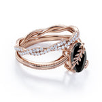 Bestselling 1.50 Carat Oval cut Wedding Ring Set with Black Diamond for Women in Rose Gold. This is a beautiful antique black Diamond wedding ring set with engagement ring and wedding bands showcases total 1.5 carats perfect lab created black diamond and glittering diamonds and is made in solid 10k Rose Gold. The beautiful wedding ring band is handmade and personalized by me or one of my other skilled jewelry associates with over 15 years of experience. And as always, the order comes with our 30 DAYS FULL REFUND policy, GUARANTEED DELIVERY within 5 Days, and in a BEAUTIFUL Jewelry Ring Box.