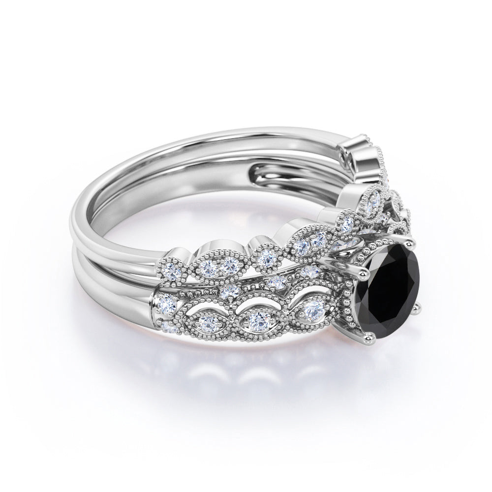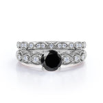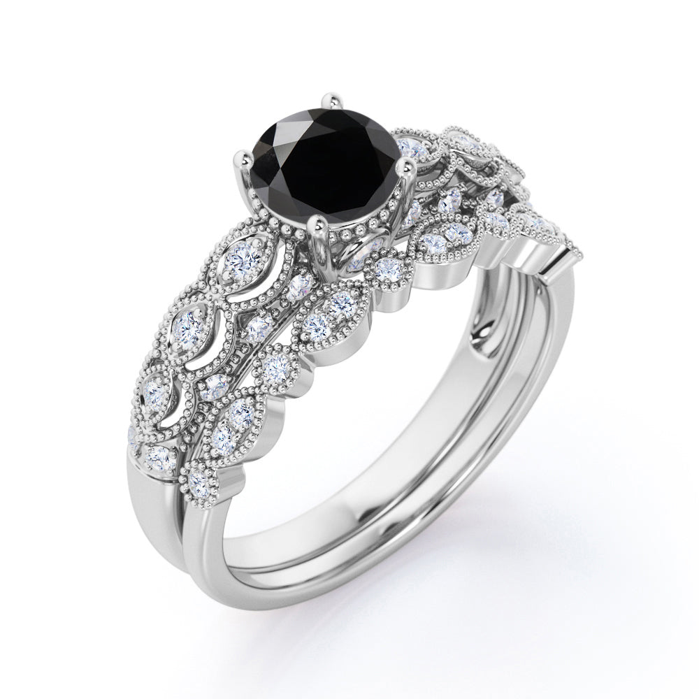Bestselling 1.50 Carat Wedding Ring Set with Black Diamond for Women in Rose Gold. Affordable yet designer black Diamond affordable wedding ring set with engagement ring and wedding bands highlights total 1.5 carats perfect lab created black diamond and glittering diamonds and is made in solid 10k White Gold. Handmade by our skilled artisan jeweler, this piece is truly one of a kind. And as always, the order comes with our 30 DAYS FULL REFUND policy, GUARANTEED DELIVERY within 5 Days, and in a BEAUTIFUL Jewelry Ring Box.