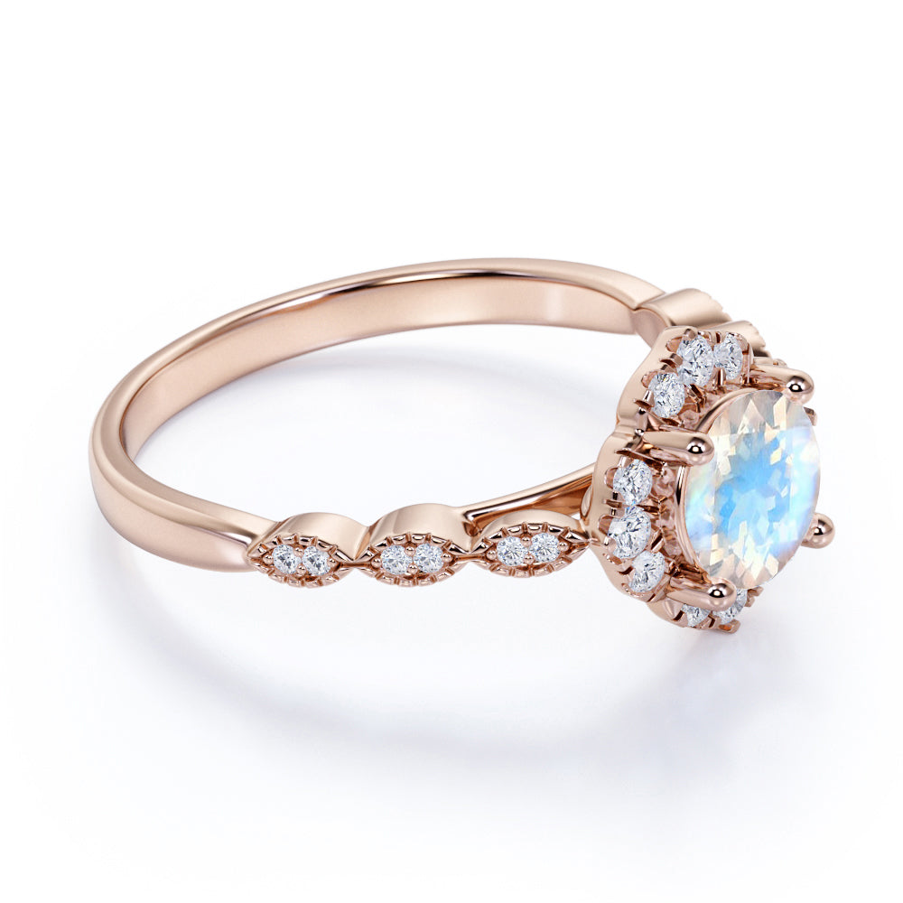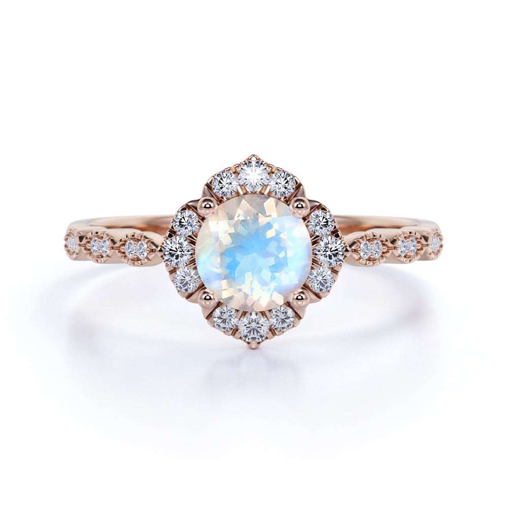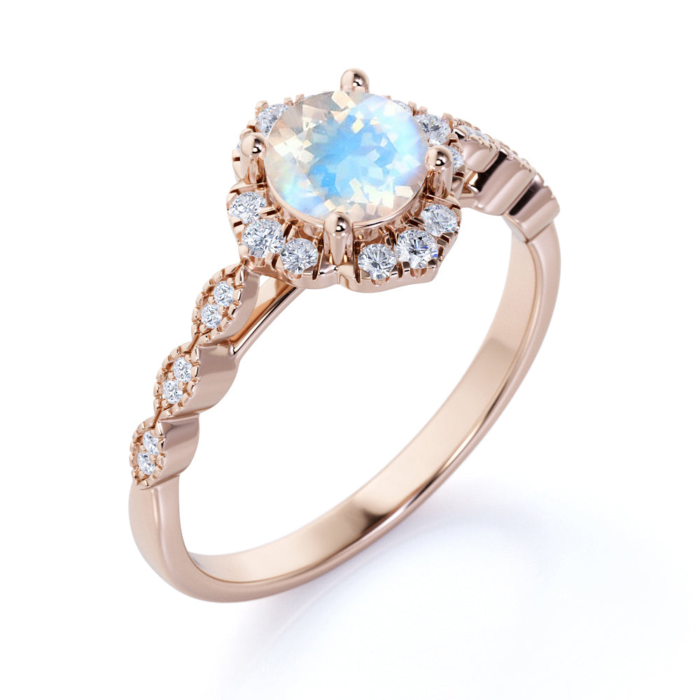 Bestselling 1.75 Carat Round Rainbow Moonstone and Diamond Antique Art Deco Engagement Ring in Rose Gold