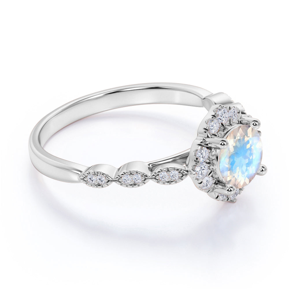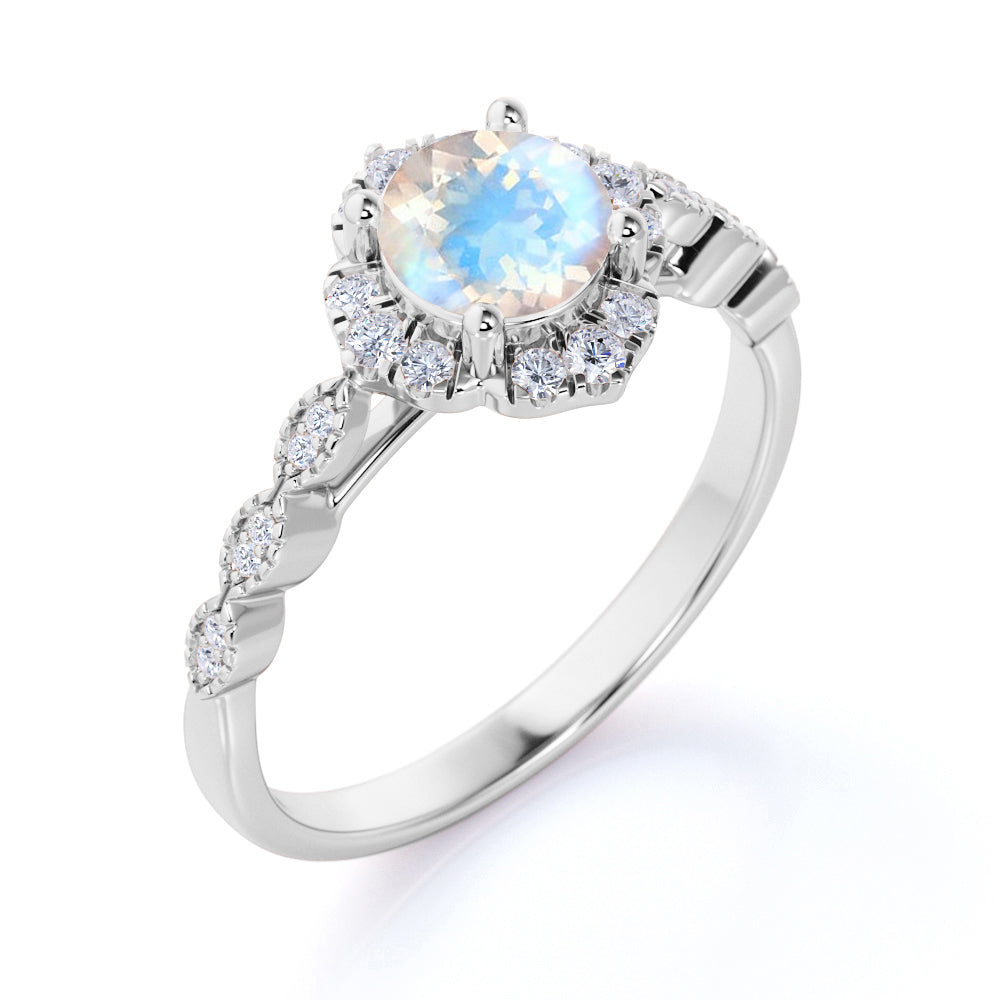 If you don't want a modern moonstone ring, this classic moonstone ring is the best for you. It reminisce your past and those times when you and her are still young lovers. If you are done with all the unnecessary crazy design, this minimalist moonstone ring is for you. This moonstone ring features an approximately 1.50 carat round shape genuine moonstone, surrounded by .25 carat authentic side diamonds for gold ring and moissanite for silver ring, for a total weight of 1.75 carats.